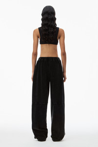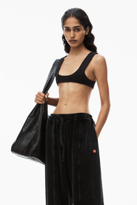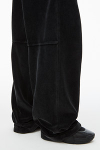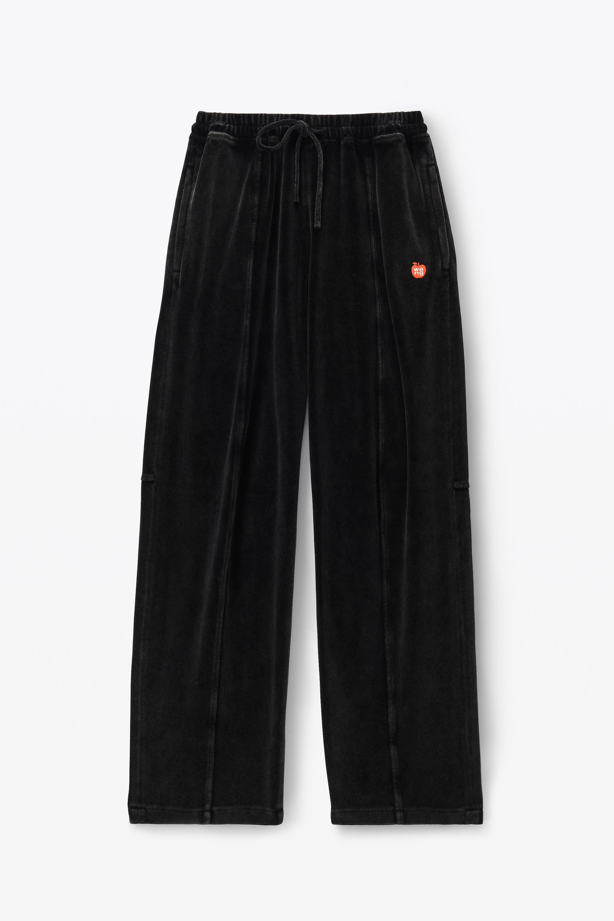 Black soft stretch velour pull on track pant with elasticated waistband and apple puff logo on left leg - loose and relaxed - full length - drawcord fastening - sits on high hip - unlined - body composition: 75% cotton/25% polyester - combination composition: 100% cotton - made in china - model is 5'9" and wears size s - 4CC1244355095A composition Body: 75%COTTON/25%POLYESTER Combo: 100%COTTON