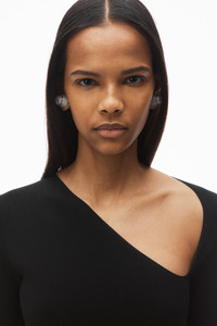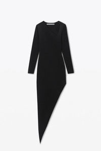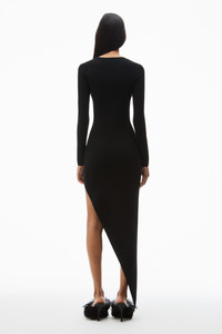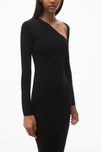 characterized by an asymmetric neckline and angled hem, this black maxi dress reflects this collection's sense of keen-edged femininity. it is cut in a bodycon fit, accentuated by a side slit. - asymmetric neckline - long sleeves - pulls over - 74% viscose/25% polyamide/1% elastane - model is 5’9.5 and wears a size s - made in china - 1kc4246036001 composition Body/Exterieur: 74%VISCOSE/25%POLYAMIDE/1%ELASTANE