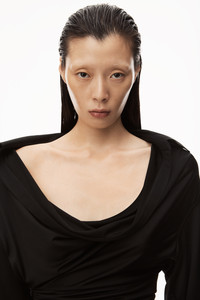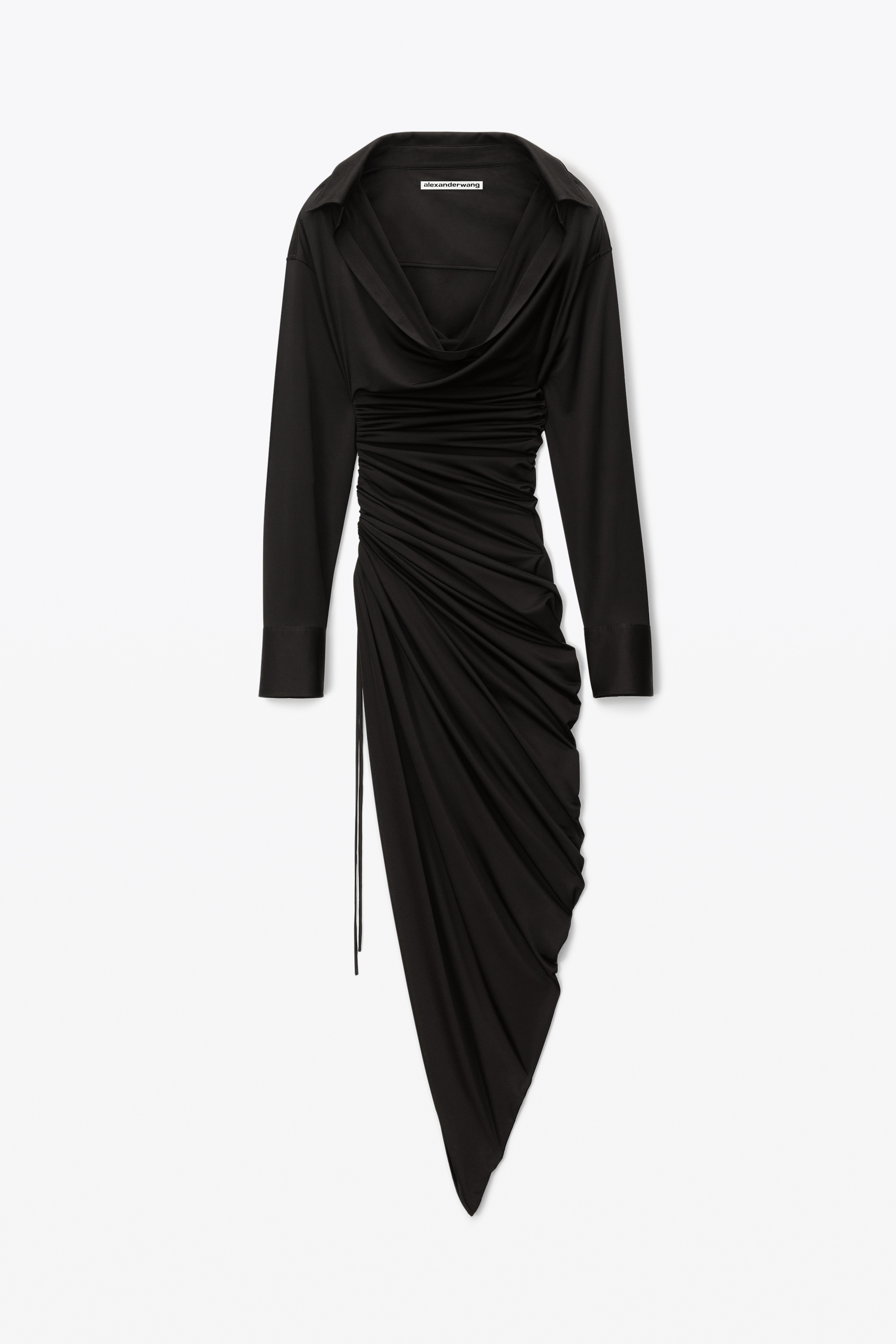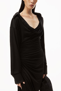 assymetrical side drape dress with deep cowl neck, falling back collar, and cinched waist in black sheer jersey - oversized sleeves - bottom hem hits calf - buttons at cuff and placket - composition: 84% viscose / 16% polyamide - made in china - model is 5'10" and wears a size s - 1CC2236571001