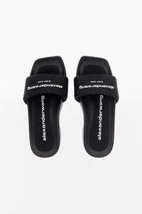 black chunky platform slide sandals with contrast logo printed upper straps - heel height: 85 mm - exterior composition: 95% polyester, 5% polyurethane - outsole composition: 100% rubber - lining composition: 100% polyester - made in china - 30322S0201 composition Upper: 95%POLYESTER/5%POLYURETHANE Outsole: 100%RUBBER WITH TEXTILE FLOCKING Lining: 100%POLYESTER