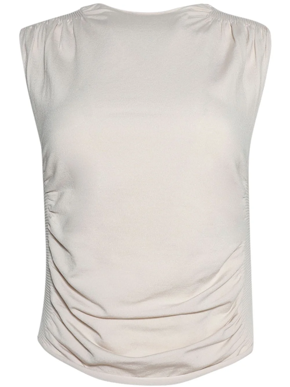 ruched top Highlights - Light beige - Crew neck - Sleeveless - Rolled trim Imported Composition Cupro 40%, Polyamide 29%, Polyester 25%, Elastane 6% SIZE & FIT Measurement LENGTH 19.29 in(49 cm) BUST 29.92 in(76 cm)