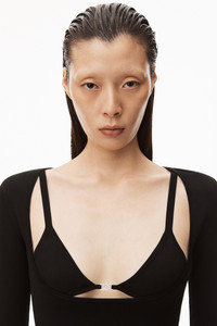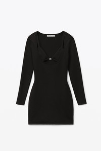 long sleeve dress with deep scoop neck, built-in bikini, and diamante logo charm closure in black stretch viscose knit - bodycon fit - bottom hem hits above knee - composition: 53% viscose / 43% polyamide / 4% elastane - made in china - model is 5'10" and wears a size s - 4KC2236004001