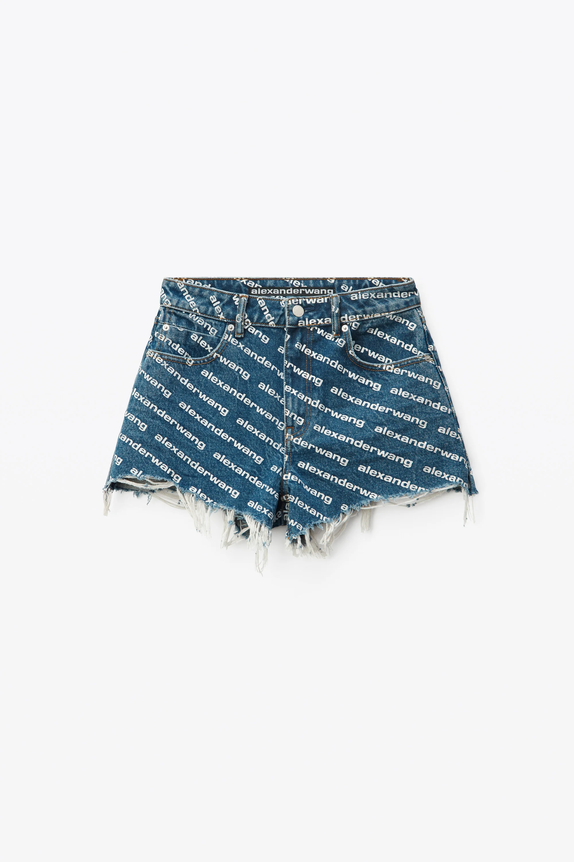 classic high-waisted cut-off shorts in deep blue indigo logo print denim - leather logo patch at back waistband - 100% cotton - made in china - model wears size 26 - 4DC1214897460