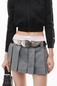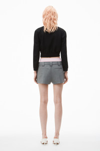 A pre-styled boxer-style brief detail lends a sharp complement to this grey wool chintz skort. It is finished with a logo waistband, belt loops, and welt pockets. - belt loops - welt pockets - elastic waistband - body composition: 86%wool/9% polyamide/5% elastane - combo: 100% cotton - lining: 100% viscose - made in China - boxy fit, hits at upper thigh - model is 5’8 and wears a size 2 - 1WC3244738050 composition Body: 86%WOOL (OVIS ARIES ARIES)/9%POLYAMIDE/5%ELASTANE Combo: 100%COTTON Lining: 100%VISCOSE