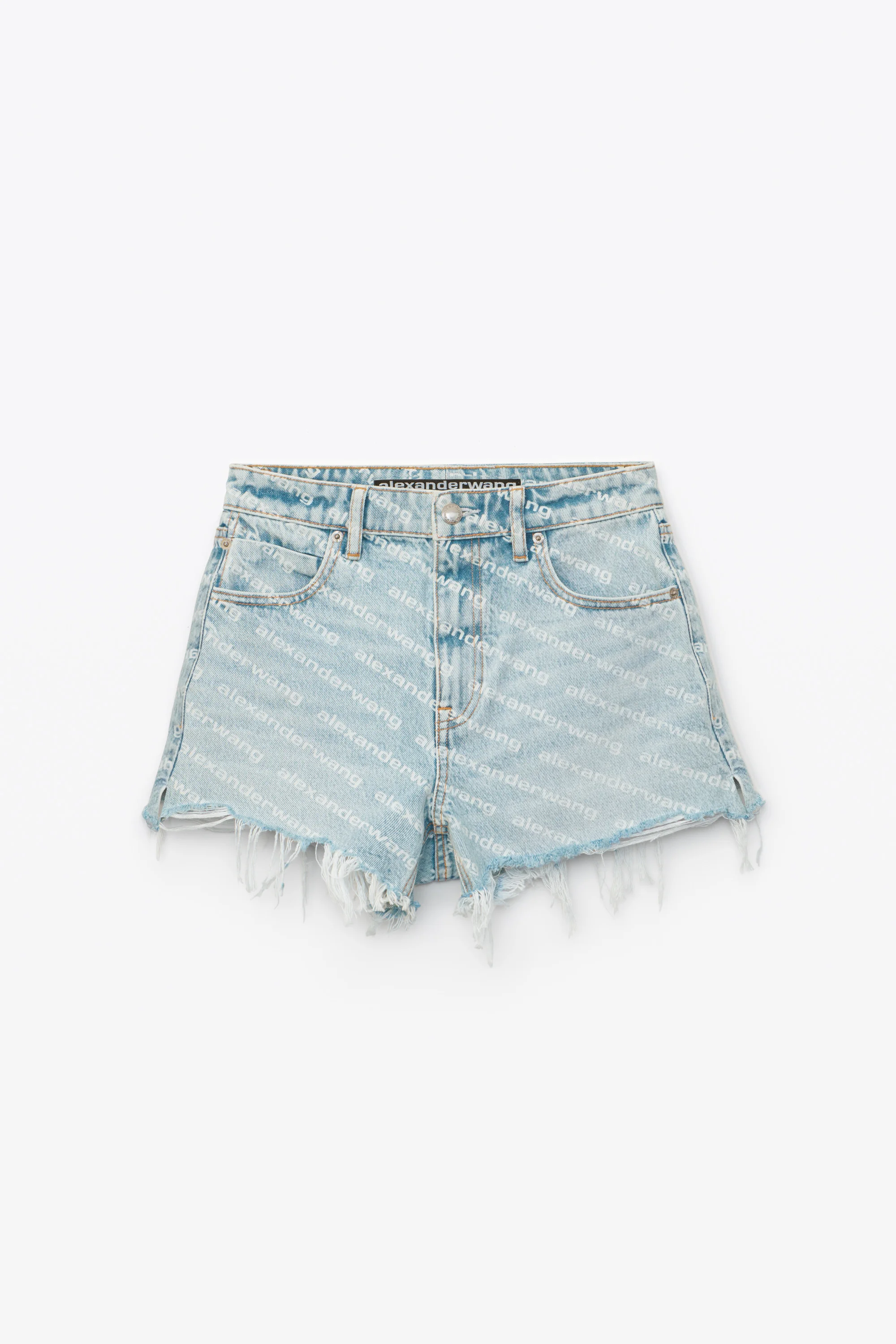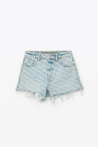 high-waisted shorts in pebble bleach indigo wash with logo print - frayed hems - leather logo patch at back waistband - 100% cotton - model wears size 26 - made in china - 4DC2204781270 composition Body/Exterieur: 100%COTTON