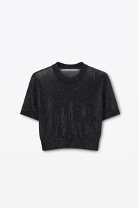 Clear hotfix beads animate this cropped, sheer black crewneck tee, finished with sweater-rib trim. - crewneck - short sleeves - body composition: 100% viscose - trim: 77% viscose/21% polyamide/2% elastane - hits above waist - model is 5'10" and wears a size s - made in china - 1KC3251048001 composition Body: 100%VISCOSE Rib Trim: 77%VISCOSE/21%POLYAMIDE/2%ELASTANE