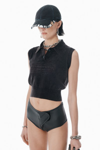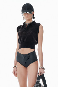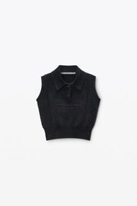 An embossed logo punctuates this polo vest, crafted from brushed cotton chenille that captures the tonal variations of the black wash. Branded faux horn buttons lend an elevated touch to this transitional knitwear style. - crewneck - short sleeves - relaxed fit, hits at waist - body composition: 88% cotton/10% polyamide/2% elastane - hits above waist - model is 5'10" and wears a size s - made in china - 1KC3251056011 composition Body: 88%COTTON/10%POLYAMIDE/2%ELASTANE Trim: 89%COTTON/10%POLYAMIDE/1%ELASTANE