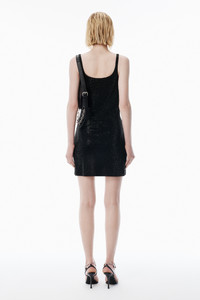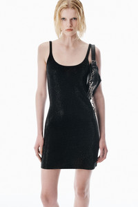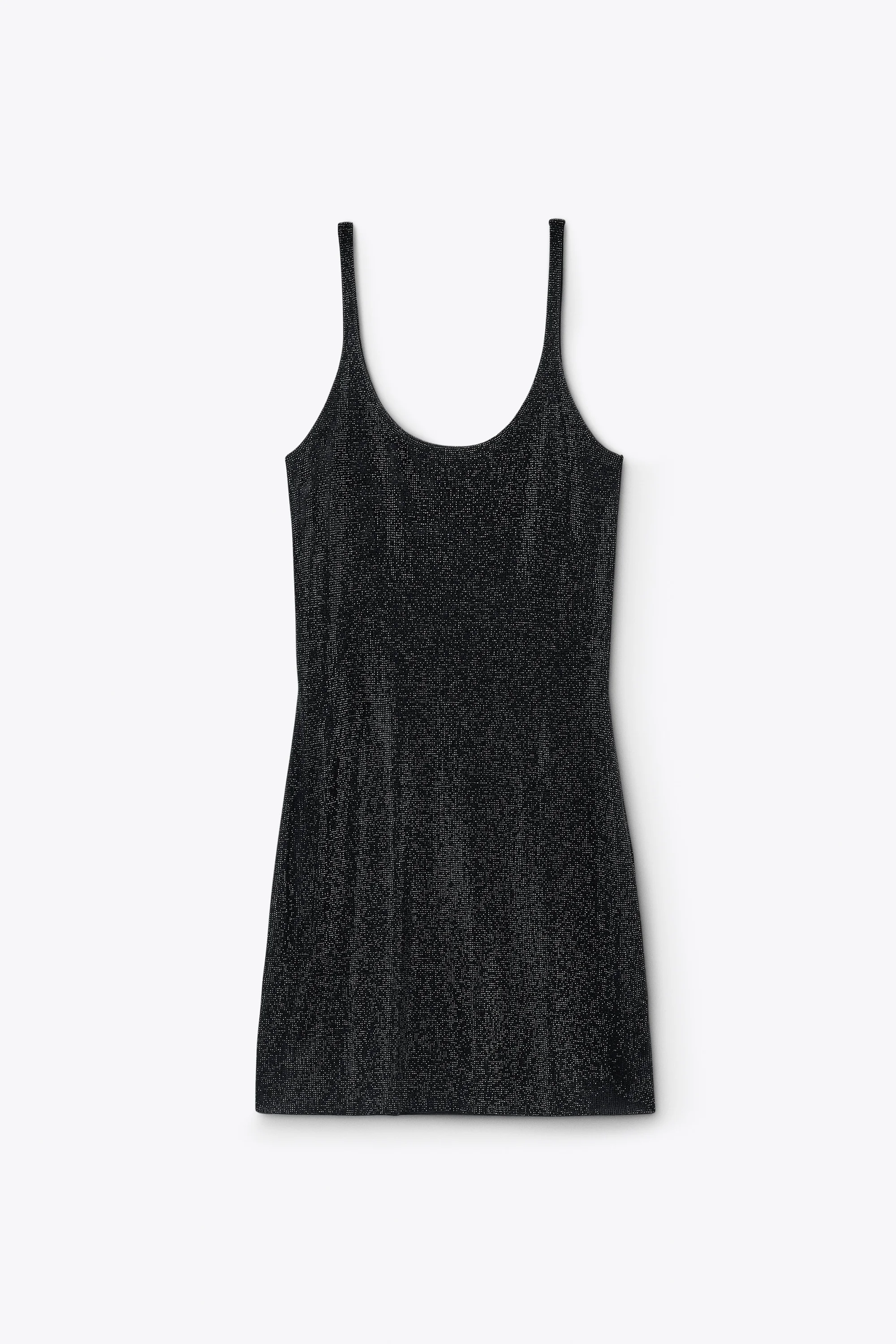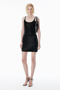 Black matte rayon dress in a fine gauge interlock stitch with a scoop neckline and fitted silhouette. Designed with subtle rib trim at the edges, this lightweight piece balances sleek structure with fluid movement. - scoop neckline - sleeveless - pulls on - hits at mid-thigh - body composition: 100% viscose - model is 5'11" and wears a size s - made in China - 1KC4256014001 composition Body: 100%VISCOSE Rib: 77%VISCOSE/21%POLYAMIDE/2%ELASTANE