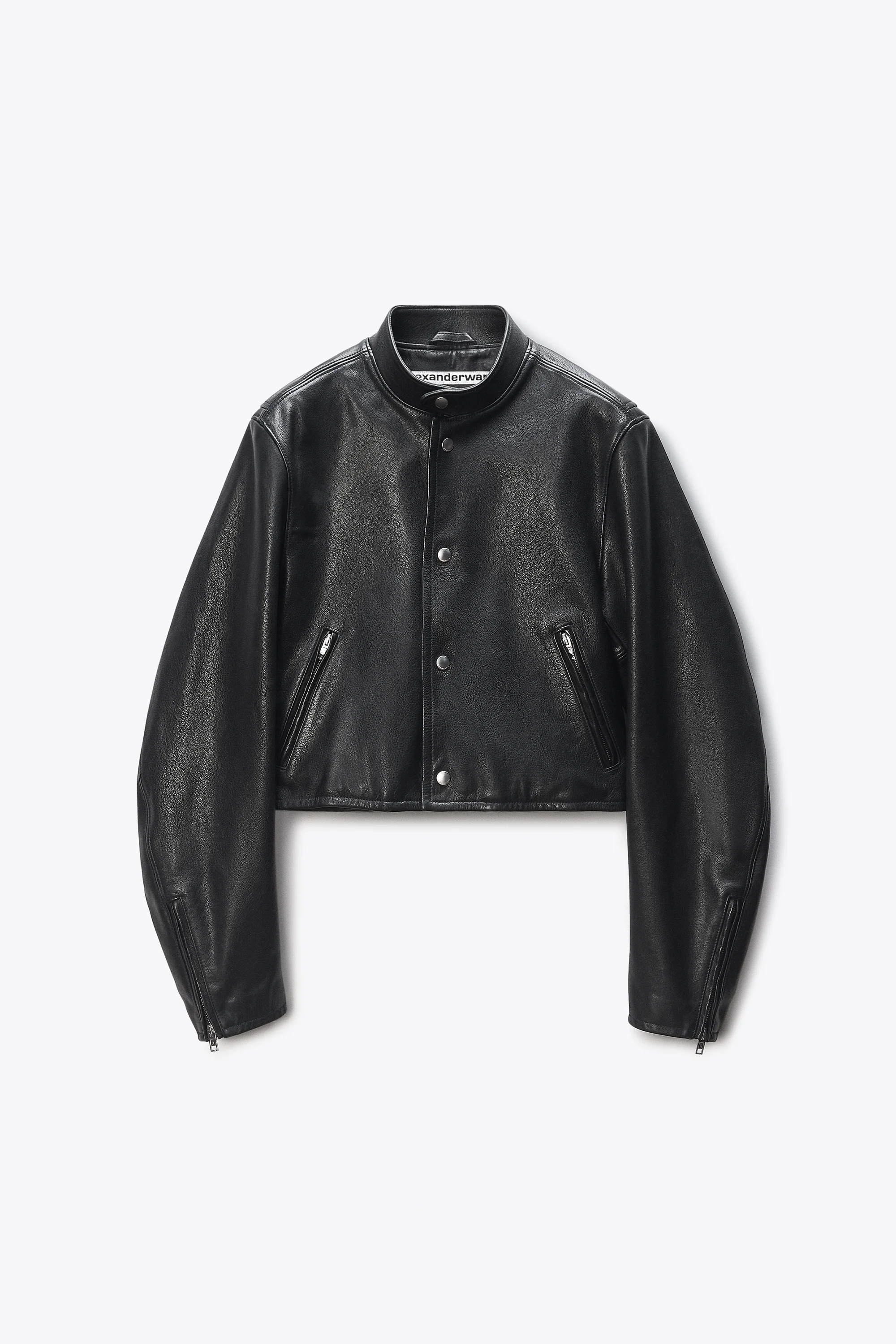 Cropped moto jacket in black vintage glossy leather with a snap front closure and vented back. Designed with a stand collar, curved articulated sleeves with gusseted vents, and besom pockets at the front. Finished with a logo patch at the back neck and lined interior. - stand collar - center front snap closure - articulated curved sleeves with gusseted vents - besom pockets at front - vented back - lined - body composition: cow leather - model is 5'11" and wears a size S - made in India - 1WC4252687001 composition Body: 100%COW LEATHER Lining: 100%COTTON