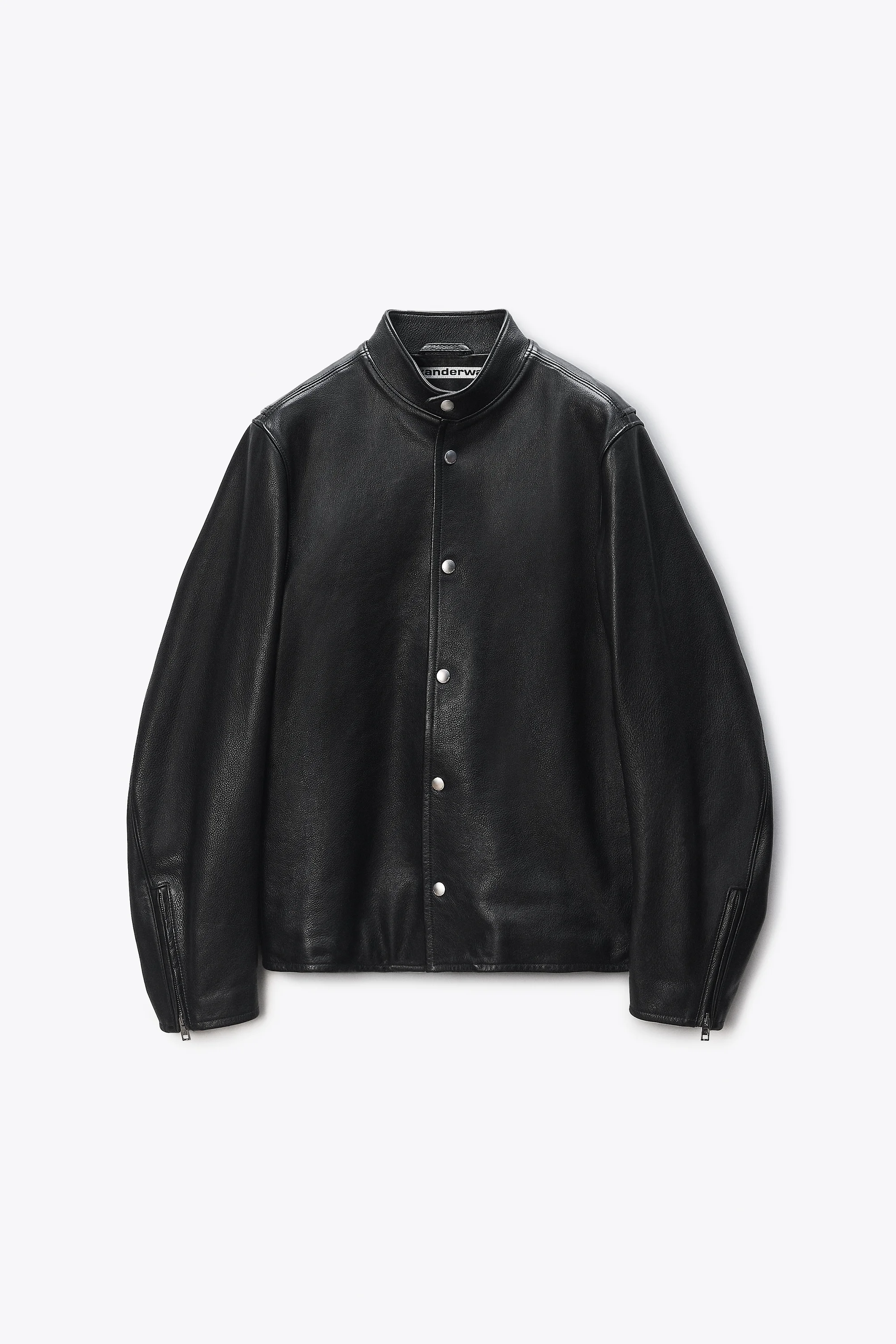 Moto-inspired jacket in black vintage glossy leather with a straight fit and articulated curved sleeves. Designed with a stand collar, snap front closure, and zipped extendable vents at the cuffs. Fully lined and finished with a logo patch at the back neck. - stand collar - snap front closure - articulated curved sleeves with gusseted vents - body composition: cow leather - model is 5'11" and wears a size S - made in India - 1WC4253285001 composition Body: 100%COW LEATHER Lining: 100%COTTON