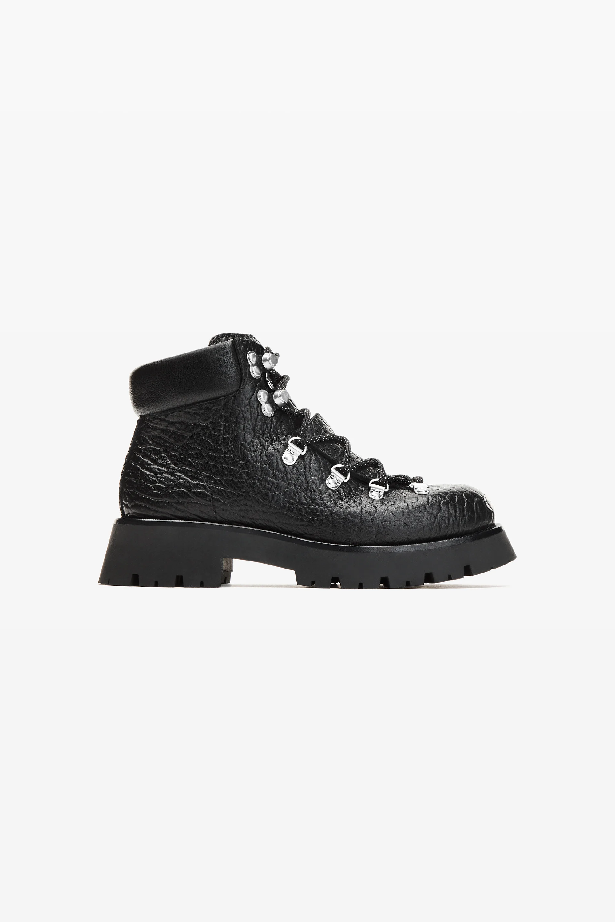 black pebbled leather lace-up boot detailed with trap-stud speed hooks and metal D-rings for utility and structure. crafted from durable pebbled leather, this everyday boot balances rugged hardware with a sleek, functional silhouette. - upper: cow leather - lining: calf leather - outsole: rubber - lace up closure - made in China - 30425B009001 composition Upper: 100%COW LEATHER Lining: 100%CALF LEATHER Outsole: 100%RUBBER