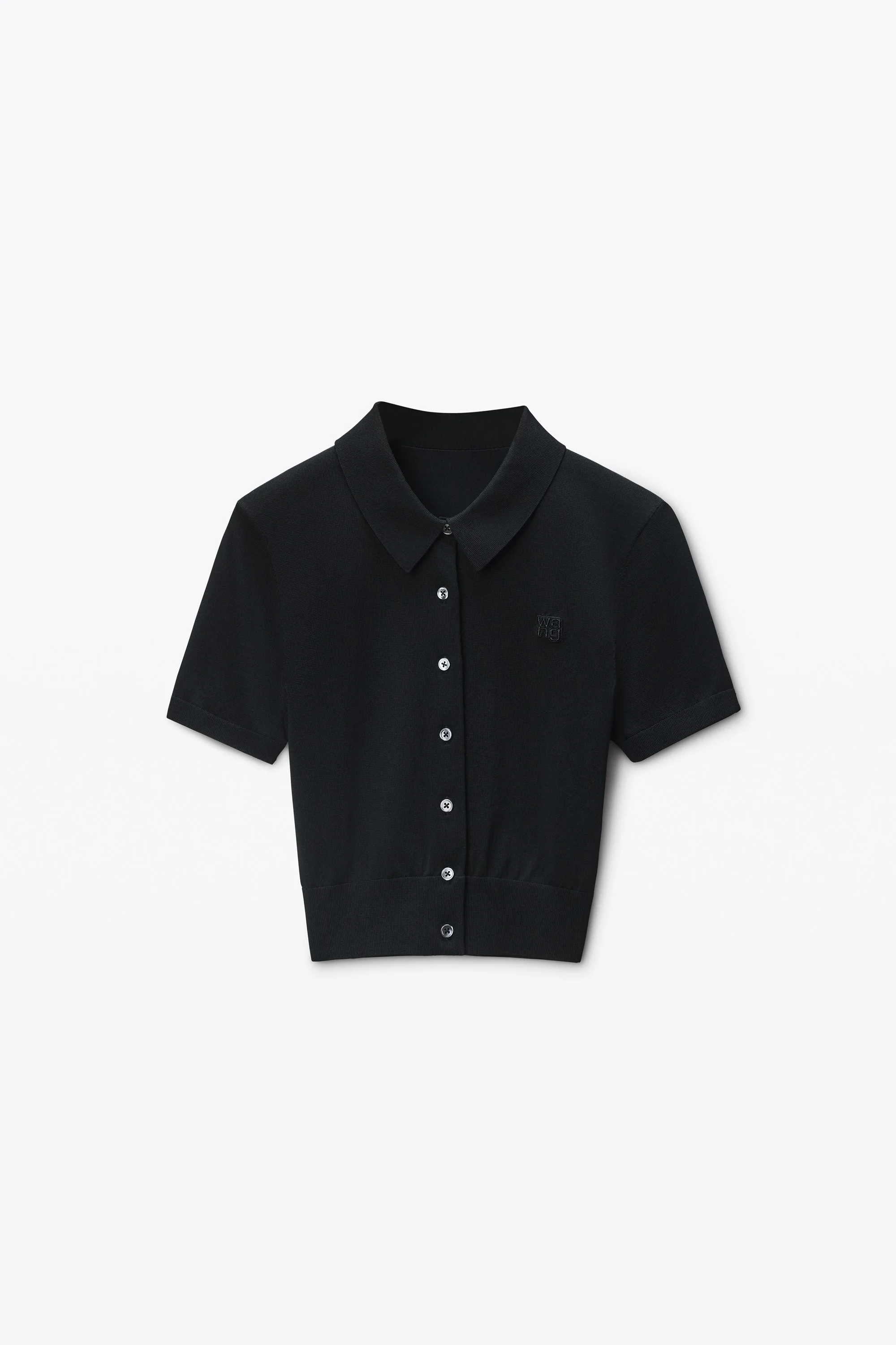Logo embroidery at the chest elevates this short-sleeve polo cardigan in black. It fastens with shell buttons and is detailed with rib trims at the cuffs and hem. - cowlneck - short sleeves - button placket - body composition: 73% viscose/22% polyamide/5% elastane - trim: 86% viscose/13% polyamide/1% elastane - made in vietnam - model is 5'11" and wears a size s - 4KC3253065001 composition Body: 73%VISCOSE/22%POLYAMIDE/5%ELASTANE Trim: 86%VISCOSE/13%POLYAMIDE/1%ELASTANE