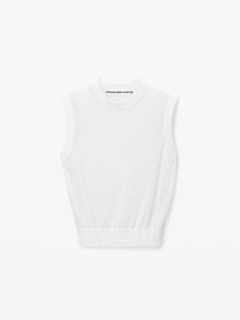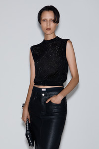 Clear beadhotfix creates a glossy wet look to this sheer black mockneck tank top. - mockneck - sleeveless - body composition: 100% viscose - trim: 77% viscose/21% polyamide/2% elastane - made in china - model is 5'10.5" and wears a size s - 1KC1251078001 composition Body/Exterieur: 100%VISCOSE Rib Trim: 77%VISCOSE/21%POLYAMIDE/2%ELASTANE
