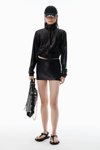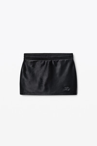 accentuated by side slits, this low-waist satin faille miniskirt in Black features a stacked logo at the hem and is fastened with an interior drawcord. - drawcord waistband - body composition: 92% polyester/8% elastane - made in china - model is 5'11" and wears a size s - 4CC3254920001 composition Body: 92%POLYESTER/8%ELASTANE