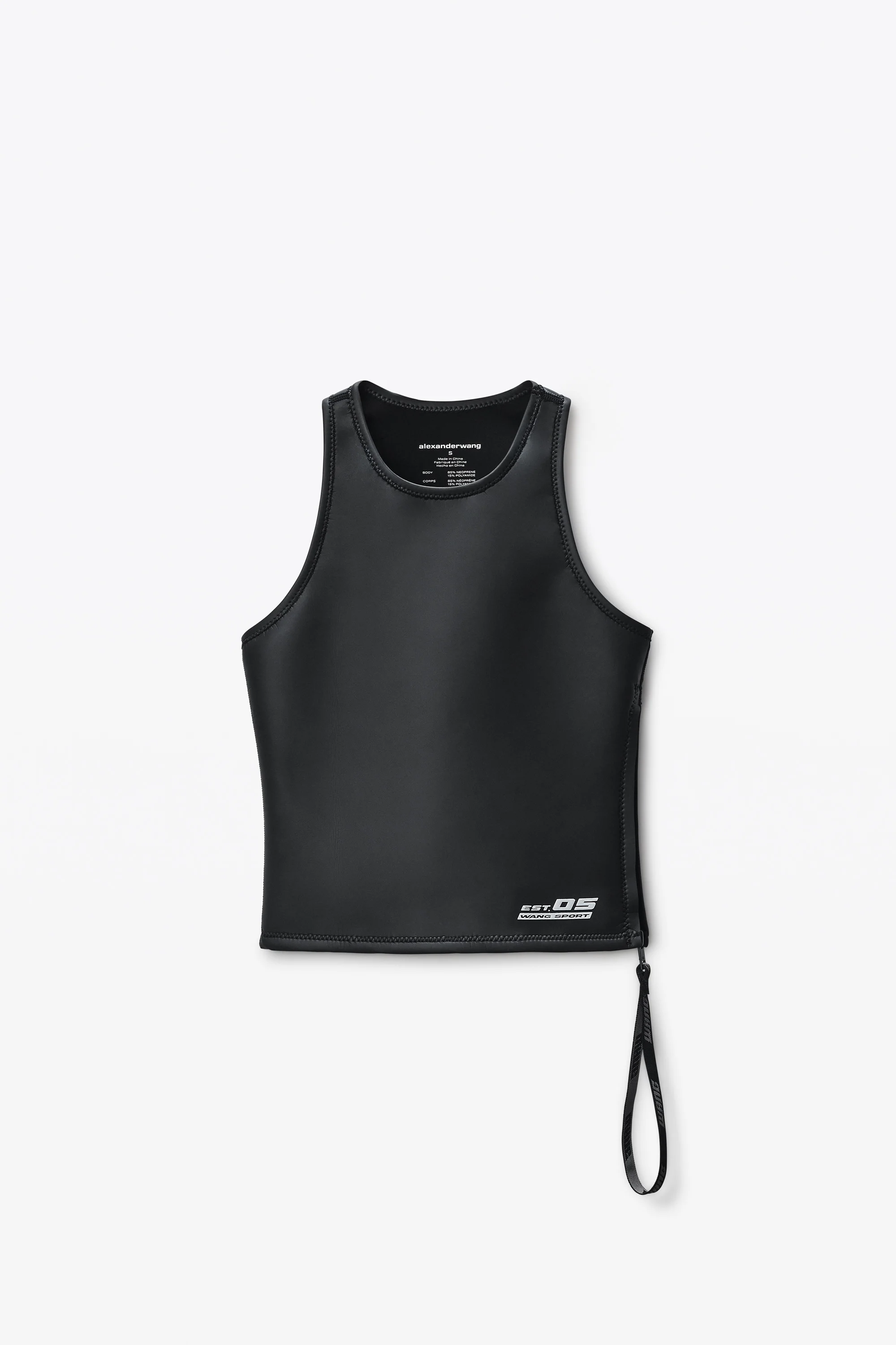 Logo graphics accentuate the slick and sporty appeal of this black scuba-style tank top, finished with zig-zag stitching, flatlock finishings, and side-zip detailing. - crewneck - sleeveless - side-zip openings - body composition: 100% rubber - surface composition: 100% polyurethane - base composition: 85% nylon/15% elastane - made in china - model is 5’11" and wears a size 4 - 1WC3251077001 composition SURFACE LAYER: 100%RUBBER BASE: 85%NYLON/15%ELASTANE