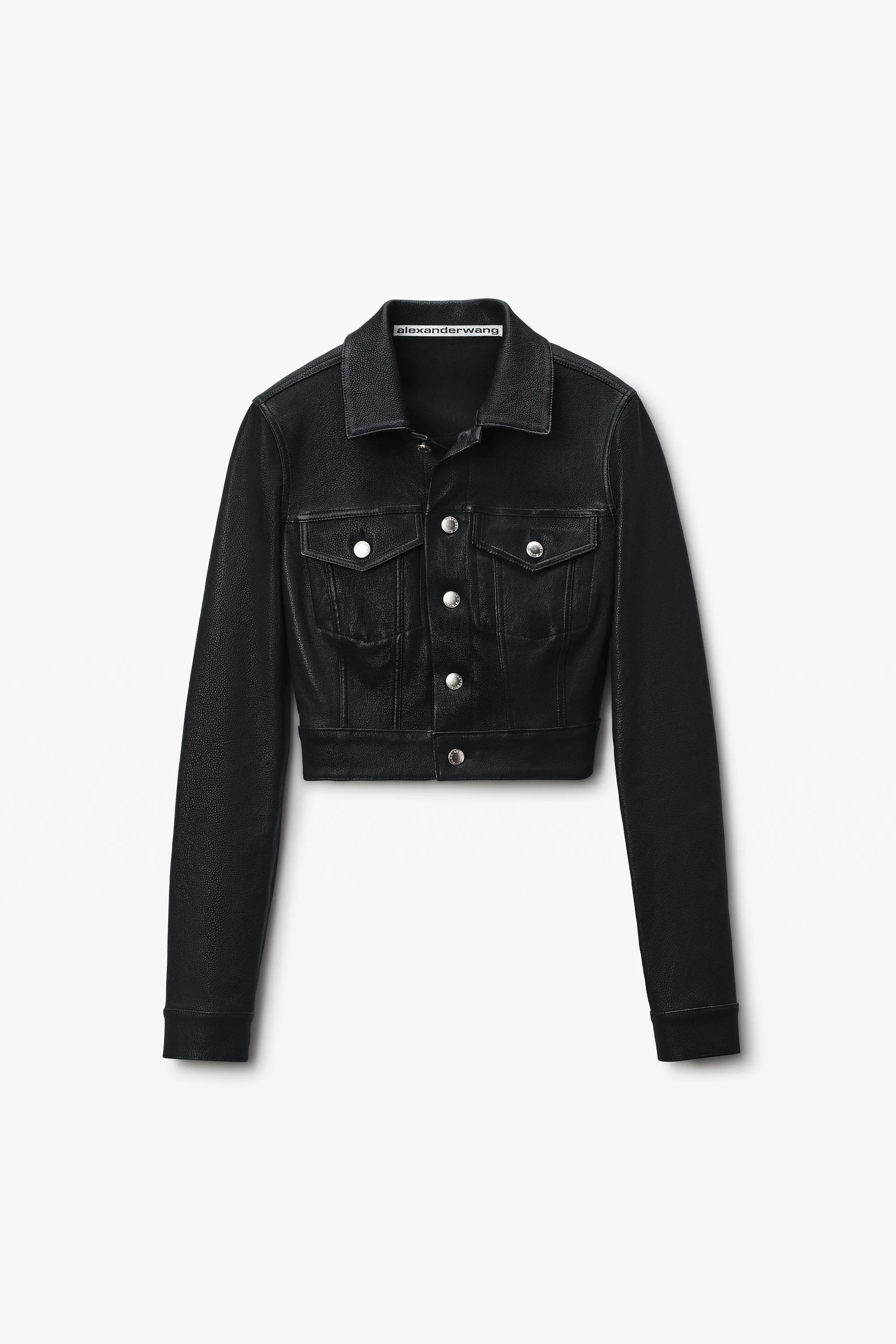 With its flat-felled seams, logo shanks, and a spread collar, this lambskin leather trucker draws inspiration from the classic denim jacket. Crafted from lambskin leather, this shrunken trucker style is detailed with flap pockets, bracelet sleeves, and a logo patch at the back. - spread collar - flap pockets - button closure - body composition: lambskin leather - material 2: 98% cotton/elastane - made in india - model is 5’11" and wears a size 4 - 1WC3252664001 composition Belt Face: 100%LAMBSKIN (OVIS ARIES ARIES) Body Back: 98%COTTON/2%ELASTANE