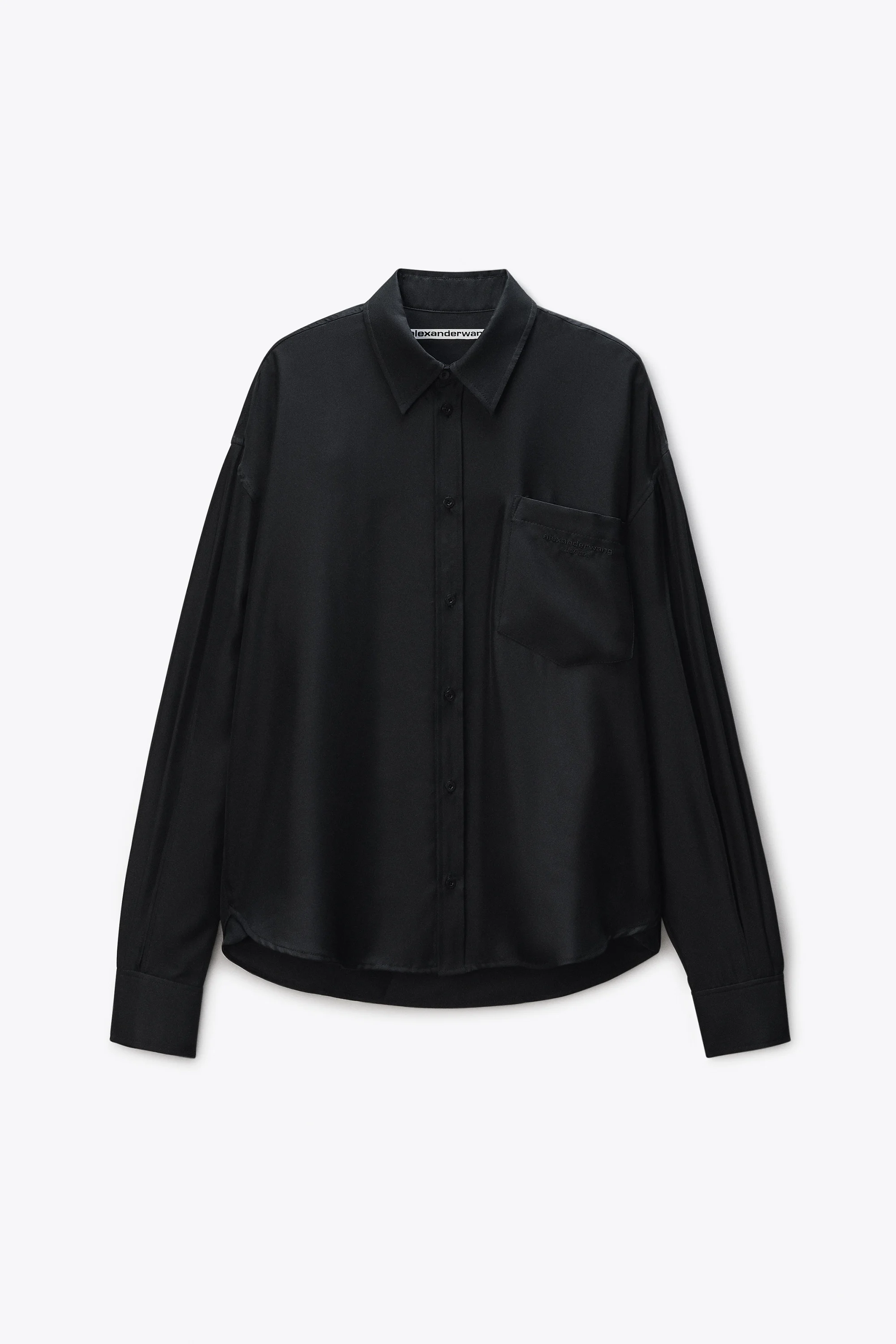 Menswear-inspired button-up shirt rendered in pure black silk with slashed sleeves that can be styled open for an exposed arm. Designed with a chest pocket featuring tonal alexanderwang logo embroidery, and finished with a classic placket and tower cuff closures. - shirt collar - button-front placket - tower placket cuffs - body composition: 100% silk - made in China - model is 5'11" and wears a size s - 1WC4251152001 composition Body: 100%SILK