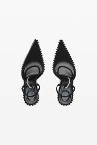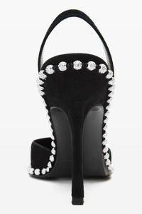 black suede slingback heel with a 105mm stiletto and crystal ball chain trim. finished with a pointy toe, leather footbed, and leather outsole for a sharp, elevated silhouette. - pointy toe - upper: suede - lining: sheep leather - outsole: cow leather - heel height: 105mm/4in - made in China - 30425P027001 composition Upper: 100%SHEEP SUEDE (OVIS ARIES ARIES) Lining: 100%Sheep Leather (Ovis Aries Aries) Outsole: 100%COW LEATHER