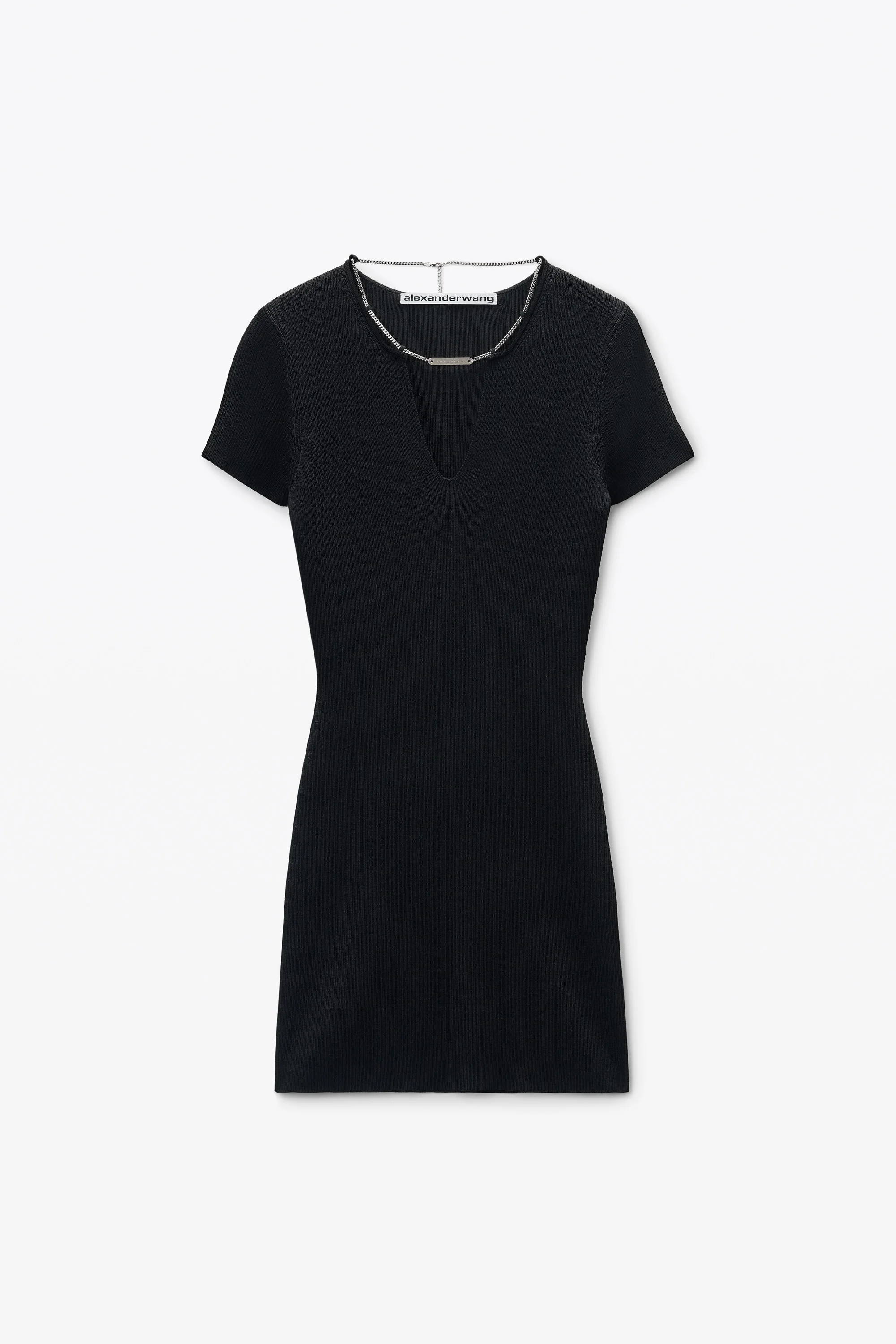 A logo nameplate defines this black minidress. It has a split neck, bodycon fit, and hits at the mid-thigh. - split neck - pull-on style - body composition: 89% viscose/9% polyamide/2% elastane - made in vietnam - model is 5'10" and wears a size s - 1KC3256063001 composition Body: 89%VISCOSE/9%POLYAMIDE/2%ELASTANE Trim: 89%VISCOSE/9%POLYAMIDE/2%ELASTANE