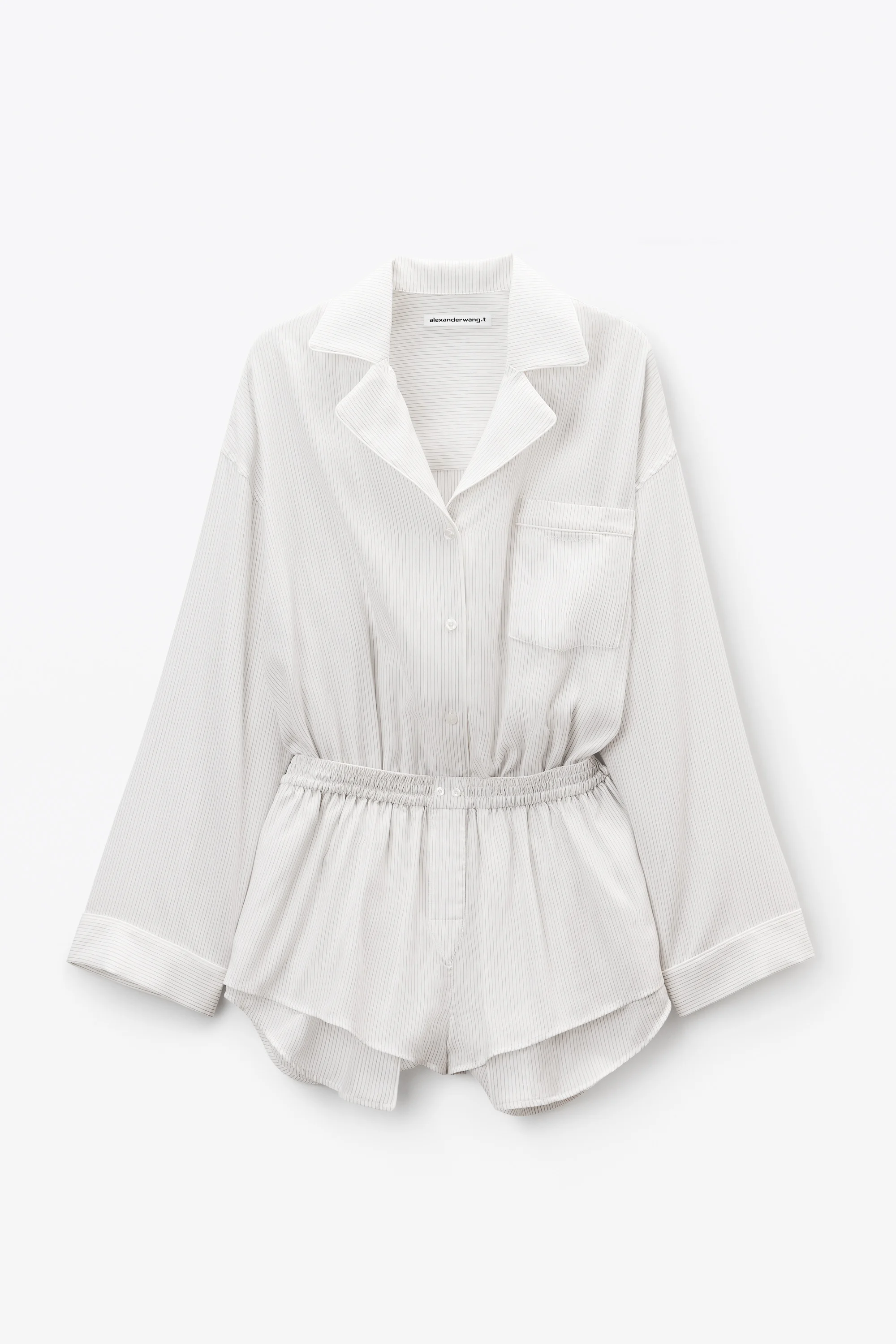 This black and white pre-styled pajama romper with boxer shorts features a notched collar, a logo-detailed chest pocket, and a button-front closure. - notched collar - short sleeves - body composition: 100% lyocell - made in china - model is 5'11" and wears a size s - 4WC3256788971 composition Body: 100%LYOCELL