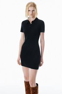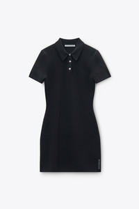 Mid-weight polo dress in black classic wool with short sleeves and a clean, body-skimming silhouette. Features a full-needle rib collar, logo buttons at the center front placket, and a knit version of the alexanderwang flag tag at the bottom hem. - polo-style collar, full-needle rib - short sleeves - logo buttons at center front placket - body composition: 88% wool / 10% polyamide / 2% elastane - made in China - model is 5'11" and wears a size S - 4KC4256063001 composition Body: 2%ELASTANE/10%POLYAMIDE/88%WOOL (OVIS ARIES ARIES) Rib: 1%ELASTANE/11%POLYAMIDE/88%WOOL (OVIS ARIES ARIES)