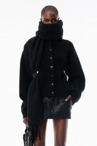 Long sleeve cardigan in soft black wool-cotton with an oversized fit and draped open back. Features tonal alexander wang embroidery at the chest, logo horn buttons at the front placket, and detachable leather tabs with metal logo snaps for waist shaping. - front-button placket - draped open back - oversized fit, hits at waist - hits at waist - logo embroidery at chest - detachable leather tabs with logo metal snaps - model is 5'11" and wears a size s - body composition: 53% wool / 25% polyamide / 21% cotton / 1% elastane - made in China - 1KC4253058001 composition Body: 53%WOOL (OVIS ARIES ARIES)/25%POLYAMIDE/21%COTTON/1%ELASTANE Rib: 54%WOOL (OVIS ARIES ARIES)/25%POLYAMIDE/20%COTTON/1%ELASTANE Belt: 100%COW LEATHER