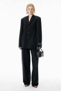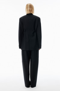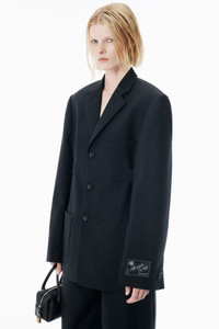 tailored in black wool mohair suiting, this structured blazer features a center-front button closure and adjustable back tabs. three patch-style pockets and branded tailoring details complete the silhouette. - single welt chest pocket - two front patch pockets - three-button front closure - adjustable back tabs - three-button cuffs - branded tailoring label at cuff - single back vent - body composition: 77% wool / 23% mohair - model is 5'11" and wears a size s - made in China - 1WC4252673001 composition Body: 77%WOOL (OVIS ARIES ARIES)/23%MOHAIR Lining: 100%VISCOSE