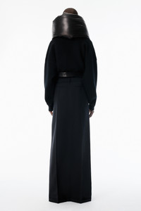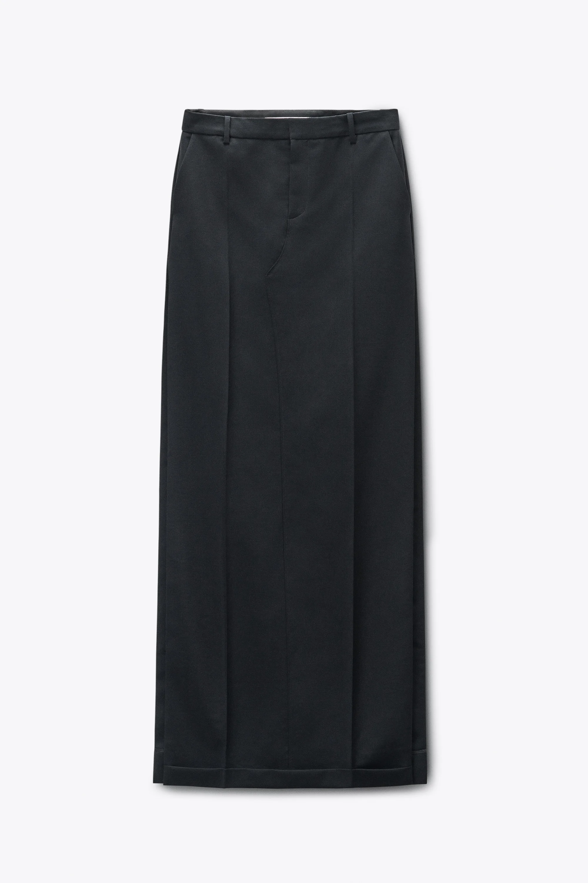 Tailored maxi skirt crafted in black wool mohair suiting with a mid-rise waist and side slits to the thigh. Designed to mimic a deconstructed pant, it features a fly front closure, belt loops, pressed creases, and a cuffed hem. Fully lined with an internal short for ease of movement. - tailored waistband with belt loops - front fly closure - side slash and back welt pockets - high side slits to mid-thigh - fully lined with internal short - cuffed hem - model is 5'11" and wears a size 4 - body composition: 77% wool / 23% mohair - made in China - 1WC4255358001 composition Body: 77%WOOL (OVIS ARIES ARIES)/23%MOHAIR Lining: 100%VISCOSE