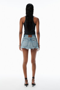This double-layer skort in powder blue features heavy distressing, punctuated by metal hardware. It is cut in a high-rise silhouette. - zip fly - five-pocket style - 100% cotton - made in china - 4DC3255812496A composition Body: 100%COTTON