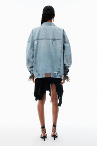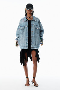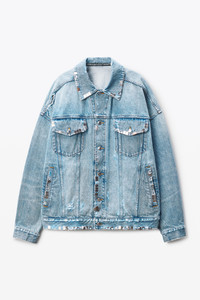 This powder blue trucker jacket features hand-appliqued hardware punctuating the oversized style. Wide dropped shoulder seams accentuate the look of this outerwear statement piece. - sprad collar - long sleeves - shank button placket - flap and welt pockets - 100% cotton - one size - made in china - UDC3252778496A composition Body: 100%COTTON