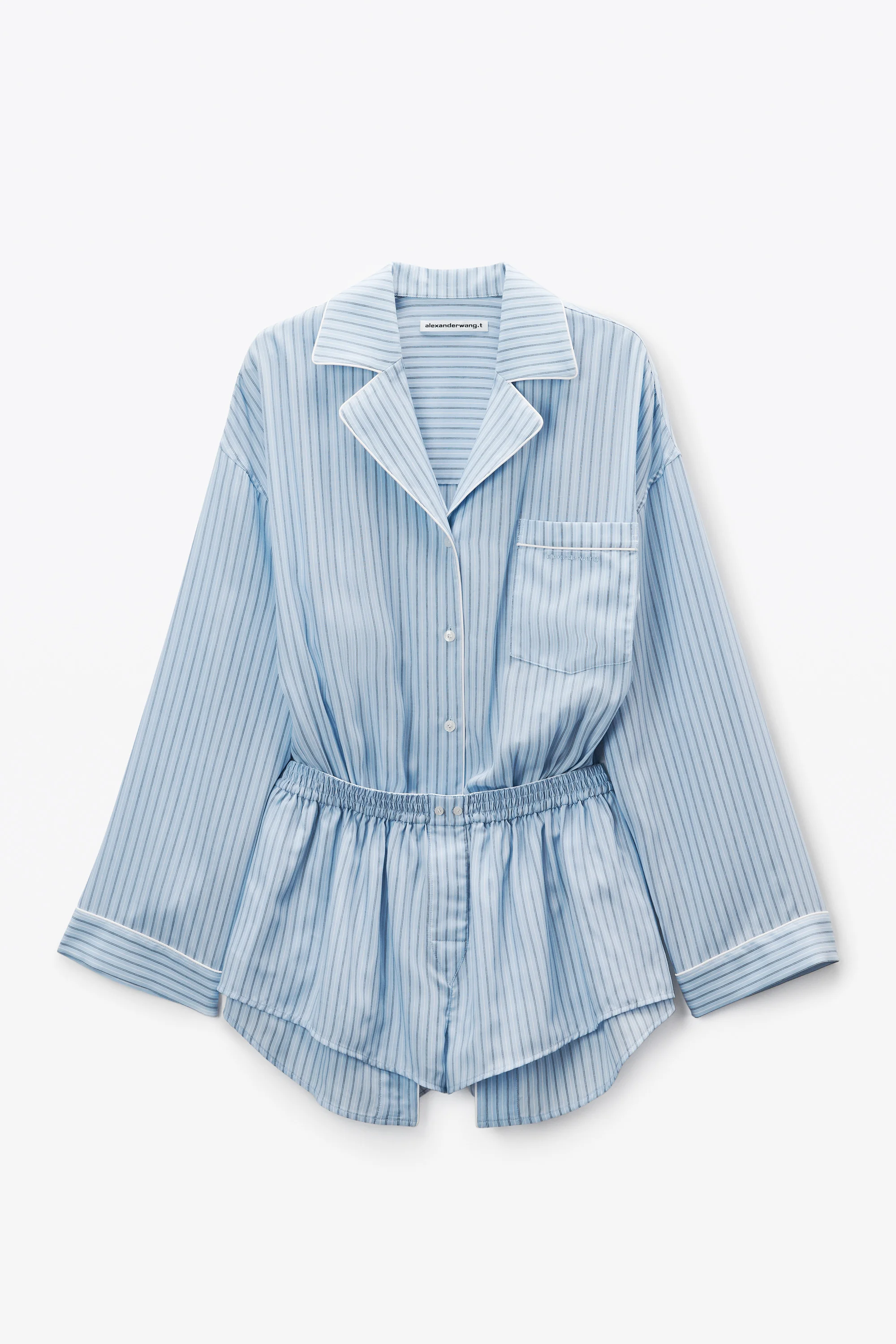 This oxford blue pre-styled pajama romper with boxer shorts features a notched collar, a logo-detailed chest pocket, and a button-front closure. - notched collar - short sleeves - body composition: 100% lyocell - made in china - model is 5'11" and wears a size s - 4WC3256788426 composition Body: 100%LYOCELL