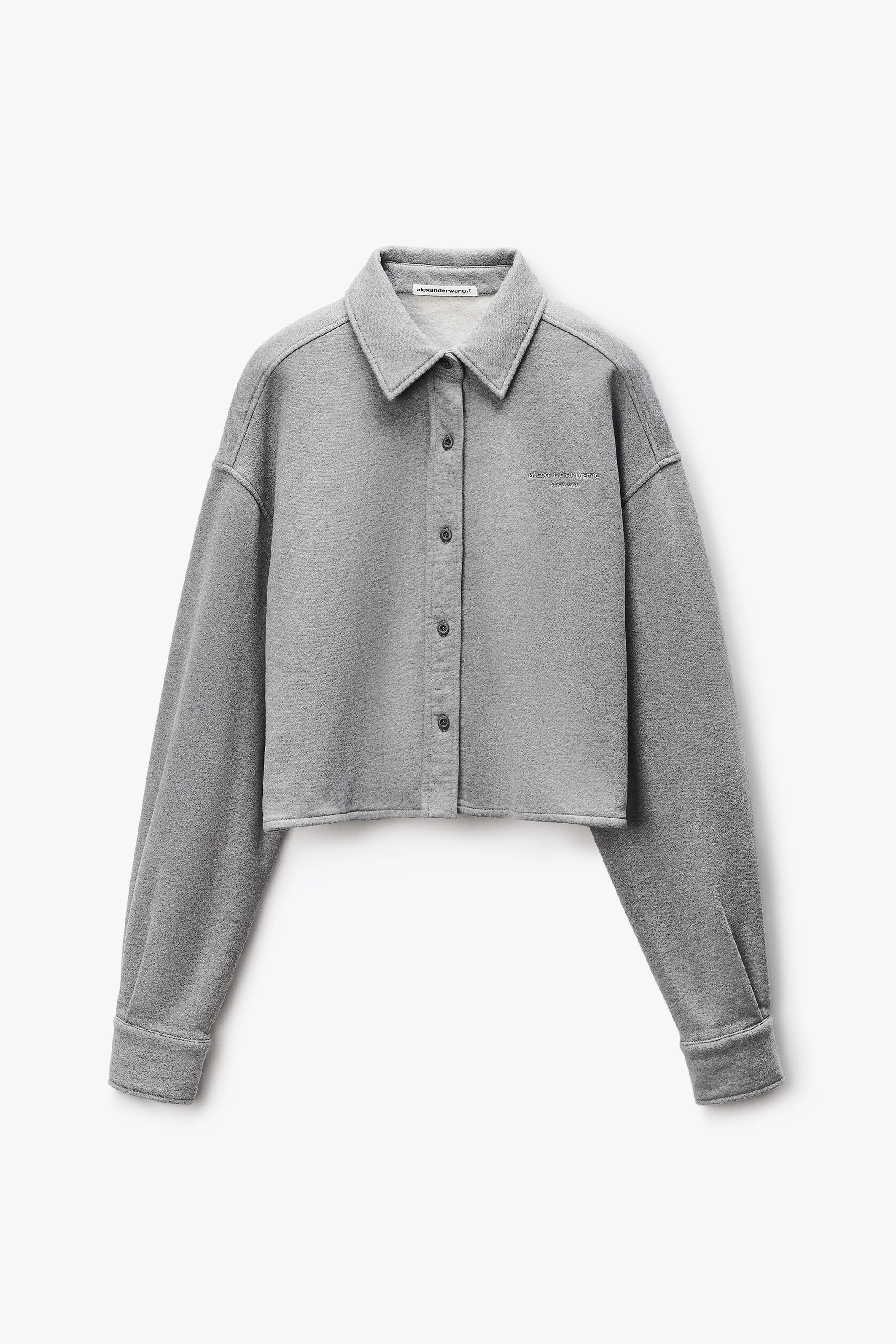 Cropped boxy shirt in organic cotton terry with classic shirting construction. Features embroidered logo at chest, front placket, and buttoned cuffs with pleated slit sleeve finish. - Dark Grey - embroidered logo at chest - body composition: 100% cotton - Made in Portugal - Model is 5'11" and Wears a Size S - 4CC1261218021 composition Body: 100% COTTON