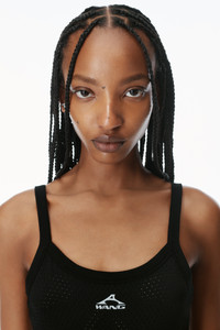 With its athletic mesh construction and 3D logo at the chest, this black mesh dress features a cropped design and is finished with sweater rib trim. - scoop neck - sleeveless - pulls over - body composition: 74% viscose/21% polyamide/5% elastane - trim: 88% viscose/10% polyamide/2% elastane - made in China - model is 5'10" and wears a size s - 4KC2256043001 composition Body: 74%VISCOSE/21%POLYAMIDE/5%ELASTANE Rib Trim: 88%VISCOSE/10%POLYAMIDE/2%ELASTANE