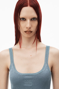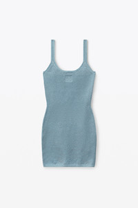 camisole tank dress with scoop neck and stacked "wang" logo embossed on front in ariel blue lurex - bodycon fit - hem hits mid thigh - composition: 52% viscose / 26% polyamide / 20% polyester / 2% elastane - made in china - model is 5' 11" and wears a size s - 4KC3236017464A composition 52%VISCOSE/26%POLYAMIDE/20%POLYESTER/2%ELASTANE RIB TRIM: 52%VISCOSE/26%POLYAMIDE/20%POLYESTER/2%ELASTANE