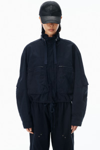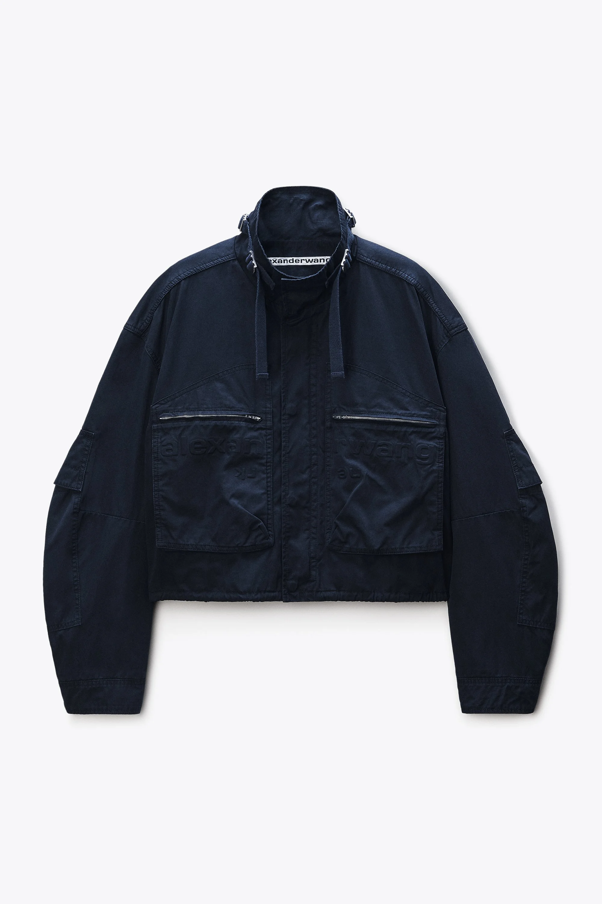 washed black cotton tailoring cut into a cropped cargo jacket with articulated sleeves and utilitarian pocketing. finished with a storm vent and vintage-inspired wash, it blends military references with modern function. - washed black - stand collar with tabs and metal adjusters - articulated sleeves with cropped length - chest patch pockets with embroidered logo and zip closures - front patch pockets with hidden snap fastening - center front zip with concealed snaps - adjustable drawcord at hem - storm vent at back with mesh lining - body composition: 100% cotton - lining: 100% cotton - Model is 5'11" and Wears a Size S - Made in Turkey - 1WC1262711011 composition Body: 100%COTTON Lining: 100%COTTON