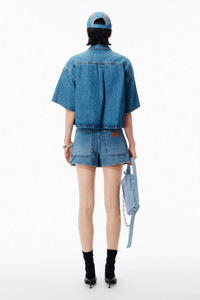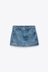 Vintage marbled blue lightweight denim mini skort in a high-rise fitted cut. Carpenter-inspired hammer loop and tool pockets bring utilitarian detail, finished with a hidden button fly and tan logo patch at the back. - Vintage Marbled Blue - Fitted - Body Composition: 100% cotton - Model is 5'11" and Wears a Size 27 - Made in Turkey - 4DC1265107400C composition Body: 100% COTTON