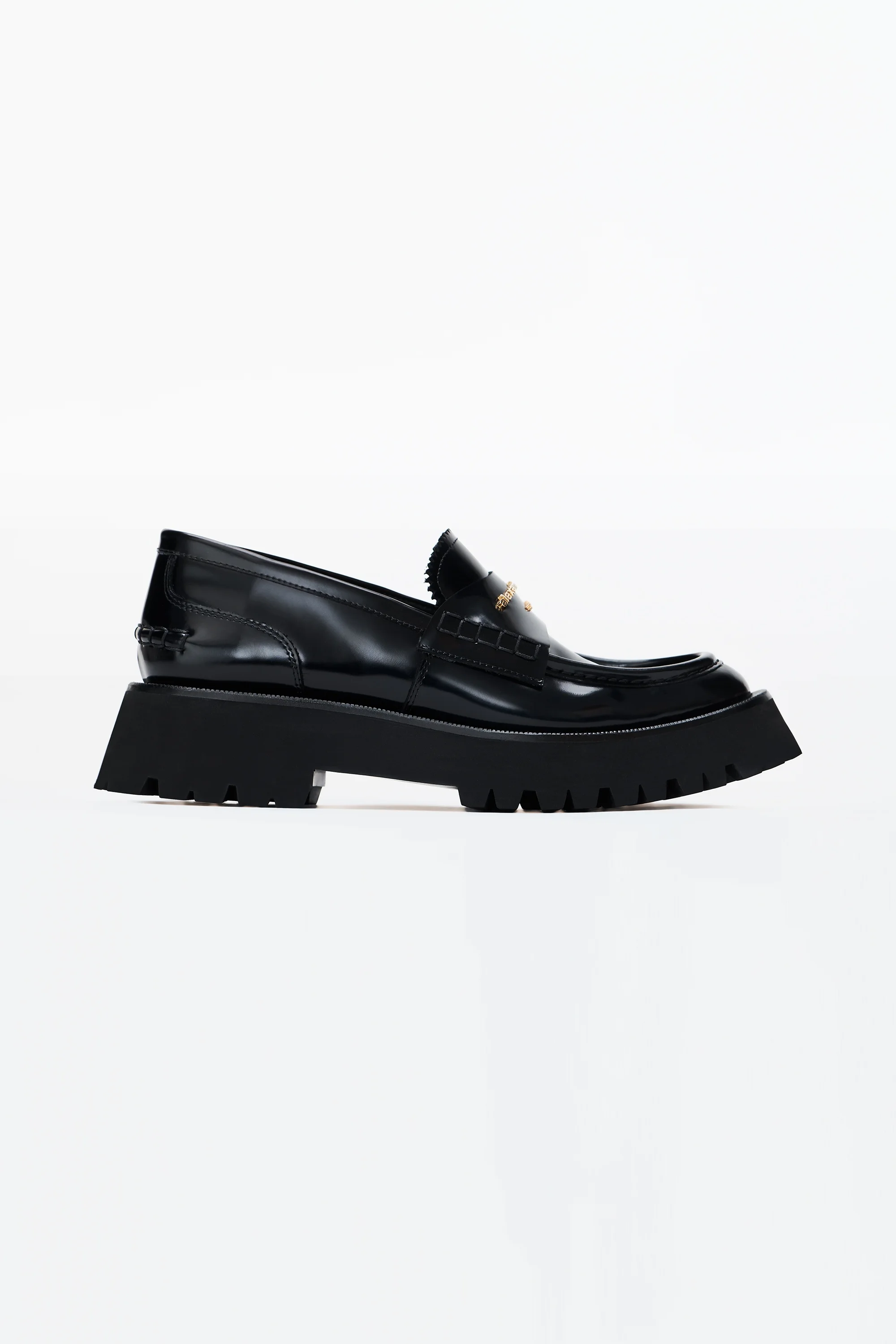 a chunky mid-heel version of our classic carter menswear-inspired loafers with metal logo detailing on keepers in black shiny box calf leather - 45 mm platform height - leather lining - upper composition: 100% calf leather - outsole composition: 100% rubber - lining composition: 100% sheepskin - made in spain - 30122F028001 composition UPPER: 100%CALF LEATHER OUTSOLE: 100%RUBBER LINING: 100%SHEEPSKIN (OVIS ARIES)