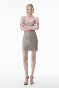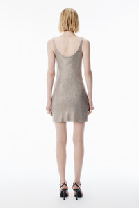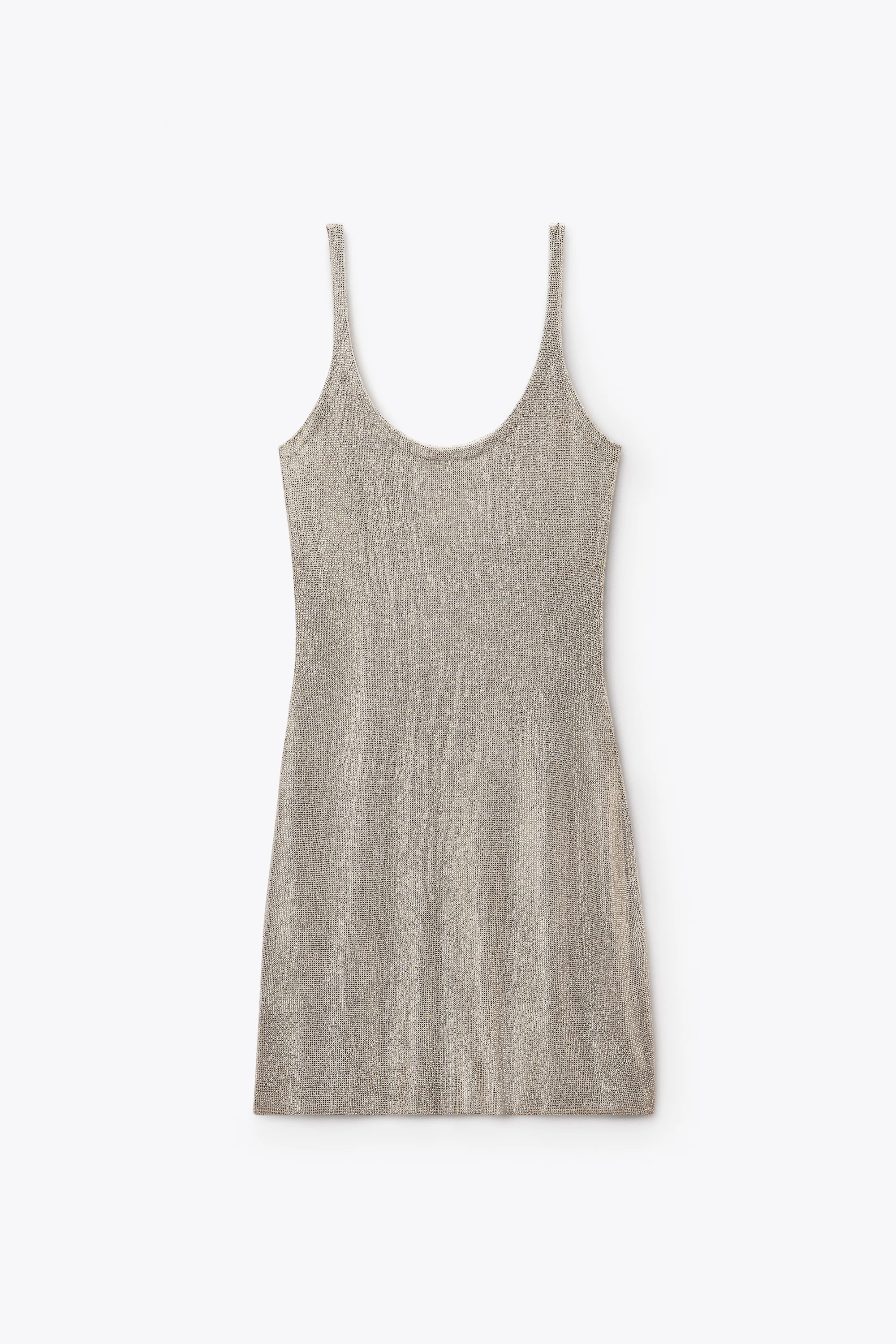 Champagne matte rayon dress in a fine gauge interlock stitch with a scoop neckline and fitted silhouette. Designed with subtle rib trim at the edges, this lightweight piece balances sleek structure with fluid movement. - scoop neckline - sleeveless - pulls on - hits at mid-thigh - body composition: 100% viscose - model is 5'11" and wears a size s - made in China - 1KC4256014255 composition Body: 100%VISCOSE Rib: 77%VISCOSE/21%POLYAMIDE/2%ELASTANE
