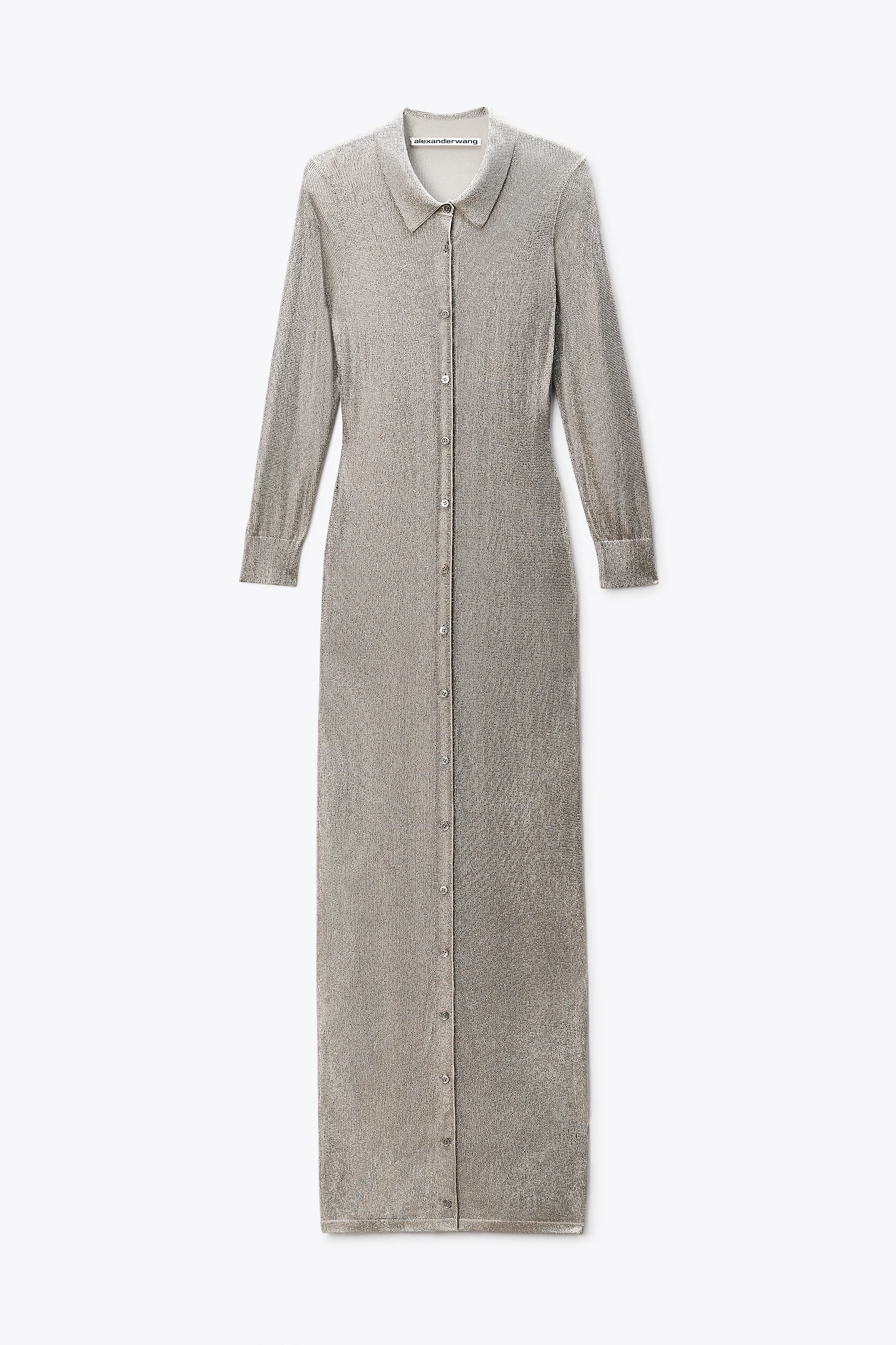 Champagne matte rayon dress crafted in a fine gauge jersey stitch with long sleeves and a button-up polo neckline. Designed with a second-skin fit through the body, this lightweight silhouette is finished with subtle rib trims that frame and define. - polo collar with button placket - long sleeves - hits above the knee - body composition: 100% viscose - model is 5'11" and wears a size s - made in China - 1K4256066255 composition Body: 100%VISCOSE Rib: 77%VISCOSE/21%POLYAMIDE/2%ELASTANE