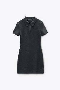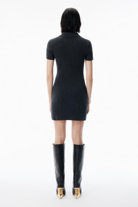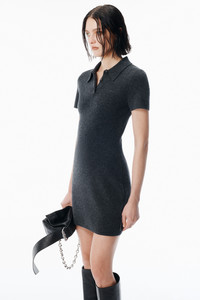 Mid-weight polo dress in charcoal classic wool with short sleeves and a clean, body-skimming silhouette. Features a full-needle rib collar, logo buttons at the center front placket, and a knit version of the alexanderwang flag tag at the bottom hem. - polo-style collar, full-needle rib - short sleeves - logo buttons at center front placket - body composition: 88% wool / 10% polyamide / 2% elastane - made in China - model is 5'11" and wears a size S - 4KC4256063010 composition Body: 2%ELASTANE/10%POLYAMIDE/88%WOOL (OVIS ARIES ARIES) Rib: 1%ELASTANE/11%POLYAMIDE/88%WOOL (OVIS ARIES ARIES)