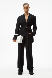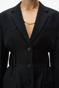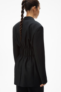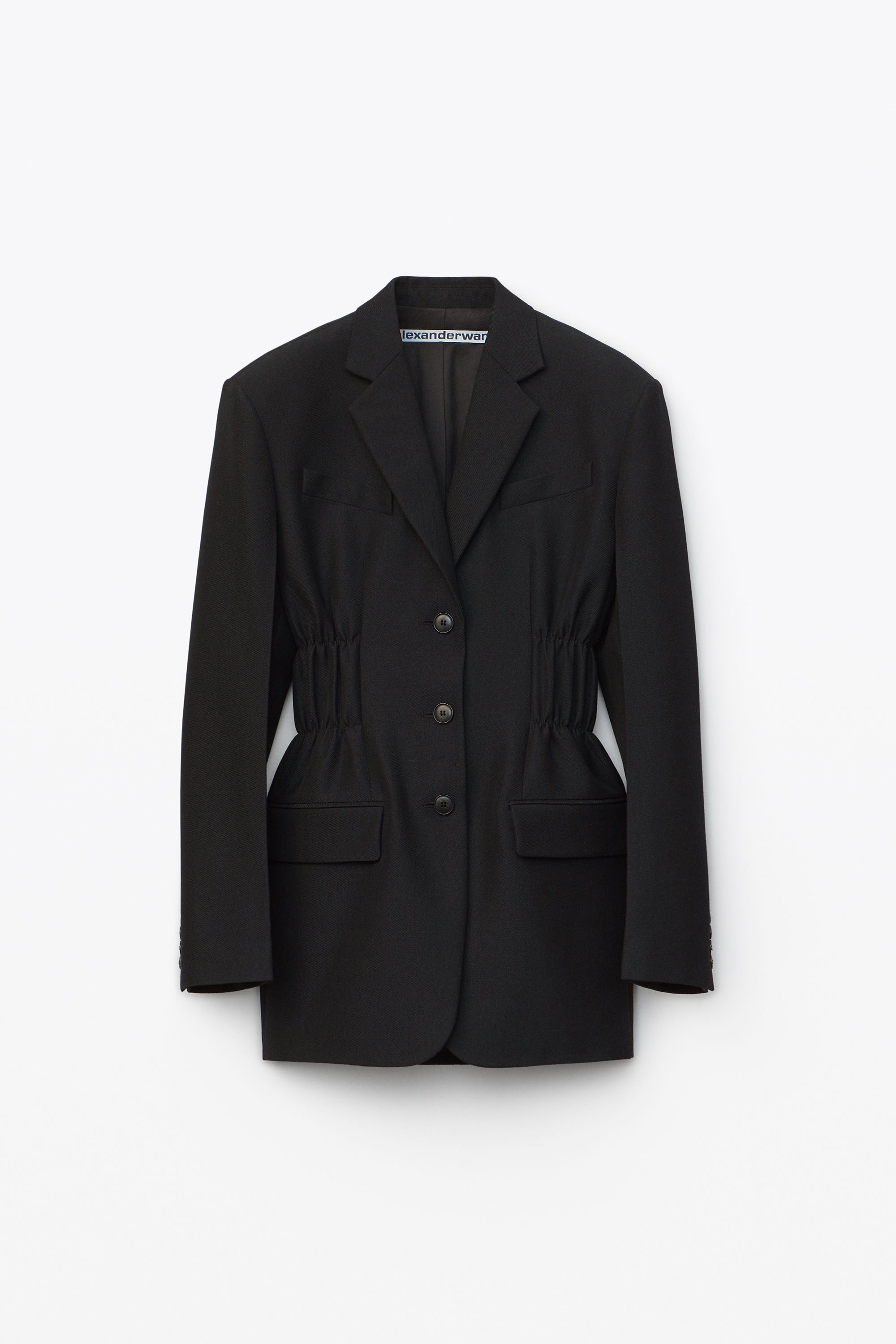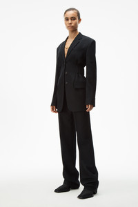 single breasted blazer with strong shouders and a cinched waist. - horn button closure - viscose lining - model wears size 2 - 65% wool / 35% polyester - made in china - 1WC2202228001 composition BD 100.0%: 65.0%WO/35.0%PL LI 100.0%: 100.0%VI FW 100.0%: 100.