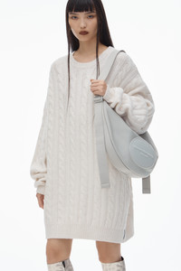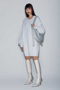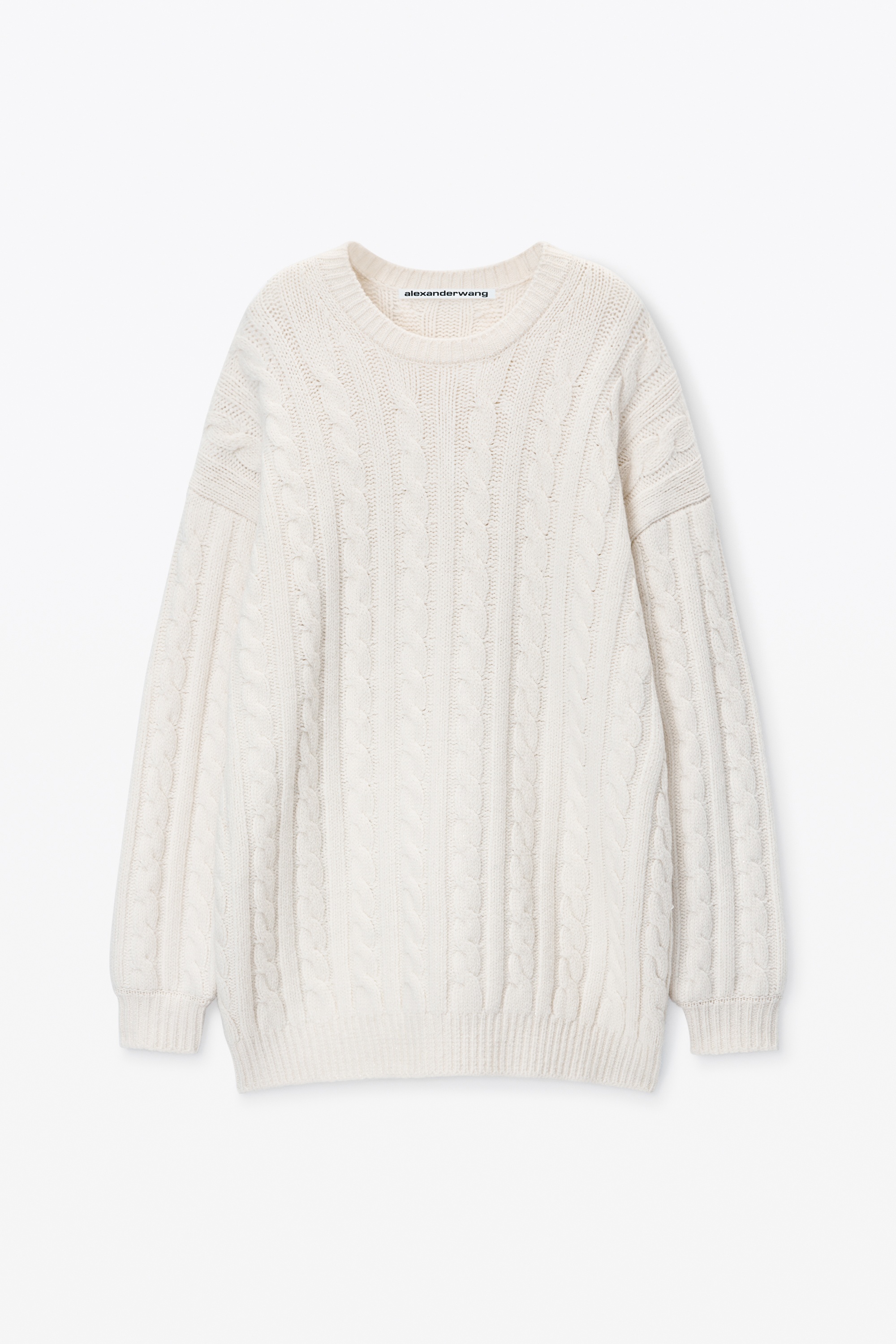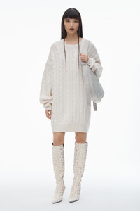 Clear bead hotfix lends a shimmering wet look to this ivory wool cable-knit dress featuring a relaxed, oversized fit. - round neckline - hits below hip - relaxed fit - pulls over - body composition: 96% wool/3% polyamide/1% elastane - trim: 97% wool/2% polyamide/1% elastane - model is 5'9.5" and wears a size s - made in china - 1KC1256092106 composition Body/Exterieur: 96%WOOL (OVIS ARIES ARIES)/3%POLYAMIDE/1%ELASTANE Rib Trim: 97%WOOL (OVIS ARIES ARIES)/2%POLYAMIDE/1%ELASTANE