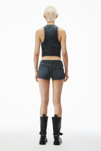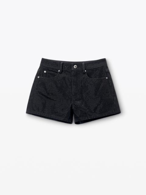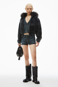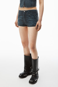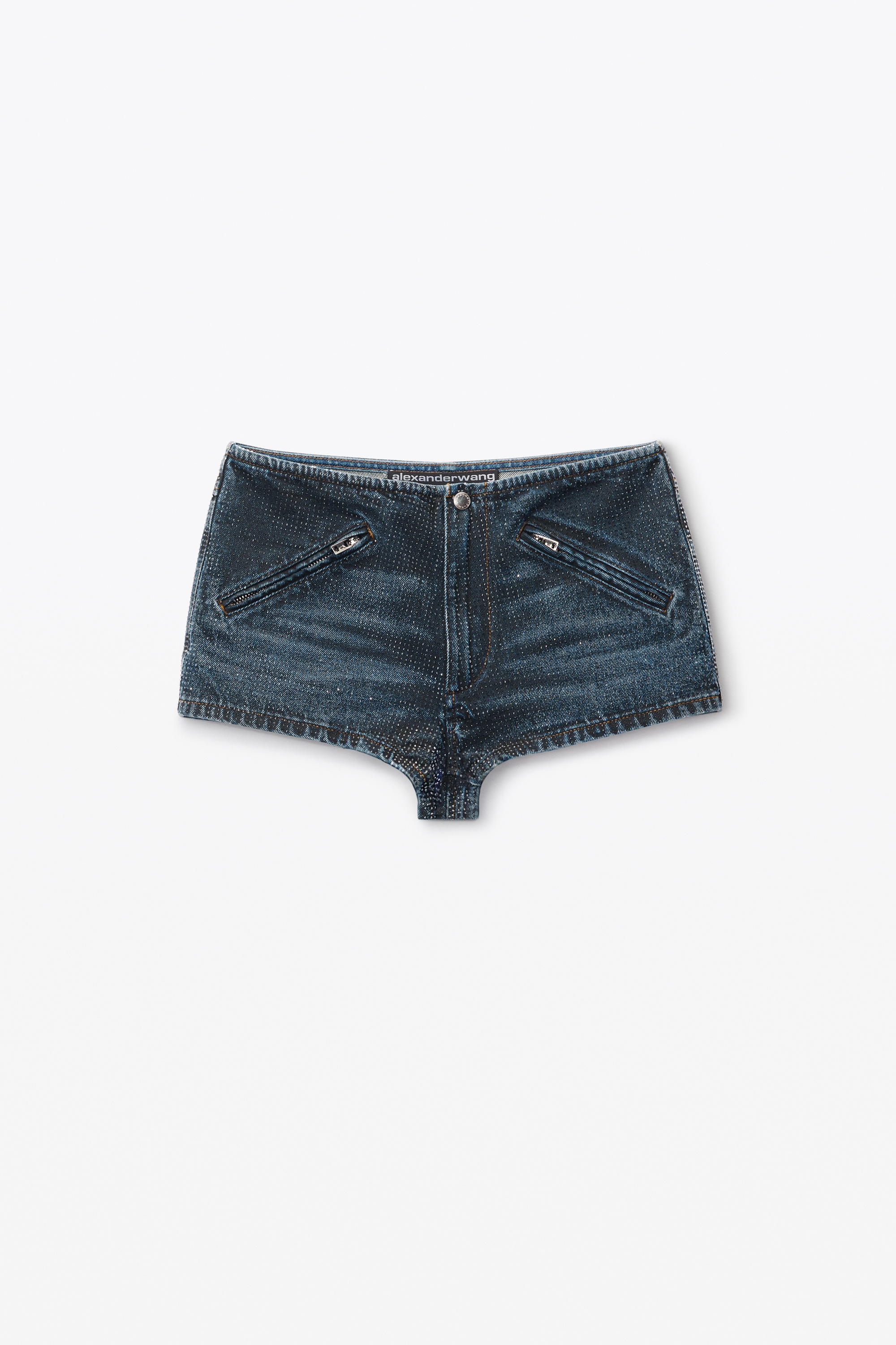 clear-bead hotfix animates this denim moto short in a black crackle indigo wash. with a form-fitting cut, this elevated separate is detailed with slanted zip pockets and fastened by a zip fly and snap closure. - zip pockets - zip fly, snap closure - body composition: 100% cotton - made in china - model is 5’9" and wears a size 26 - 1wc4244496421a composition Body/Exterieur: 100%COTTON