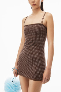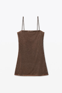 camisole slip dress with lace trims along neckline and hem and allover clear bead hotfix in chocolate light mesh - removable silk lining - loose fit hits at high thigh - adjustable straps - exterior composition: 100% polyester - lining: 100% silk - made in china - model is 5'11.5" and wears a size s - 1CC2236565206 composition 100%POLYESTER