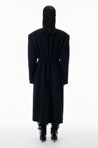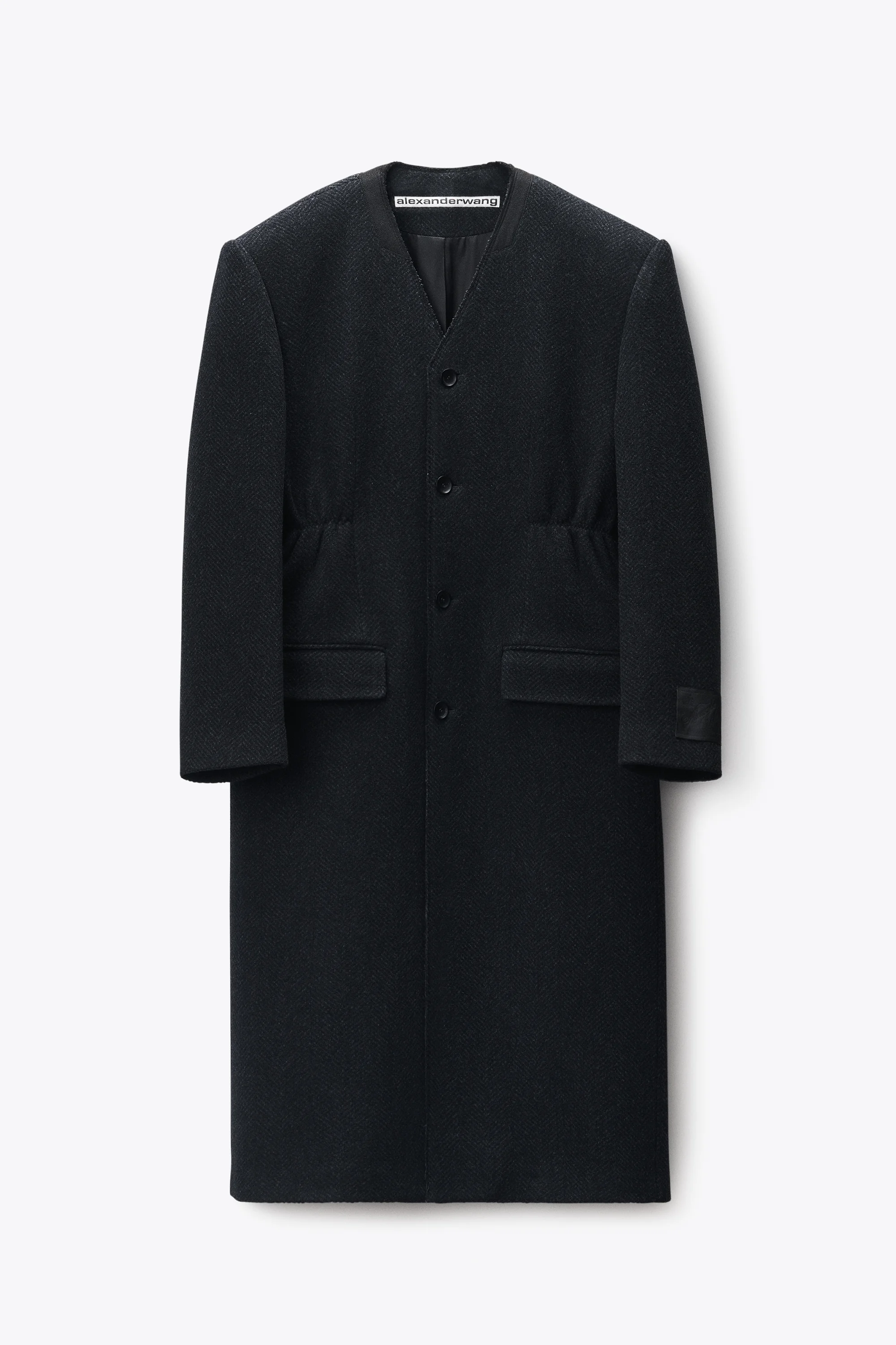 Double tweed wool blends into this oversized coat with a raw-cut V-neckline. The elasticated waist and zig-zag stitch add subtle shape, while a longline cut and flap pockets finish the look with ease. - Black/Charcoal - Collarless longline silhouette - Button closure at front - Two front flap pockets - Fully lined - Body composition: 67% wool / 28% polyamide / 5% cashmere - Lining: 100% viscose - Made in China - Model is 5'11" and Wears a Size S - 1WC1263309019E composition Body: 67%WOOL (OVIS ARIES ARIES)/28%POLYAMIDE/5%CASHMERE Lining: 100%VISCOSE