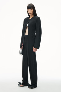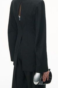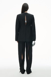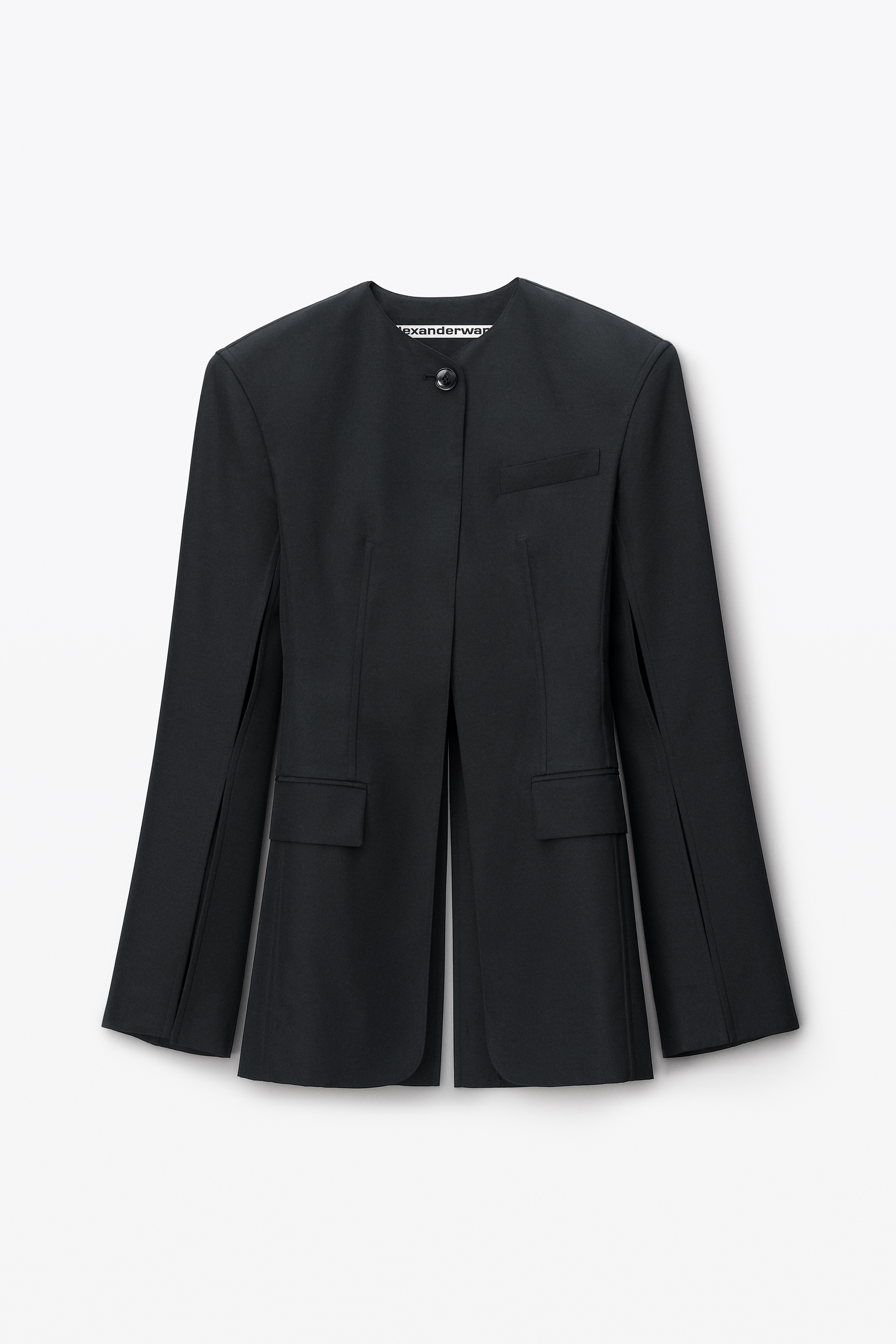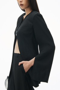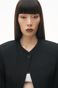 This collarless tailored black jacket—expertly crafted in a wool blend—evokes minimalist appeal with its sleek cut-away silhouette and single front-button closure. Graphic tailoring elements like slits at the sleeve and back offer ease of movement, while internal boning reinforces a sense of structure. - welt pocket at the left chest, flap pockets at the hip - unlined - body composition: 56% viscose, 44% wool - lining composition: 100% viscose - made in china - tailored fit - model is 5’10 and wears a size XS - 1WC2242545001 composition Body/Exterieur: 56%VISCOSE/44%WOOL (OVIS ARIES ARIES) Lining: 100%VISCOSE