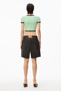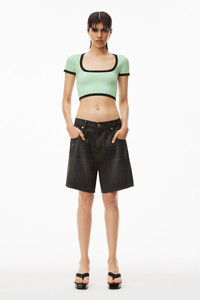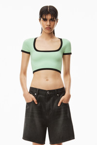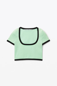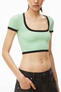 scoop neck short sleeve crop top in absinthe green nylon with contrast black trim at neckline, sleeves, and hem - bodycon fit - hem hits above waist - composition: 92% polyamide / 8% elastane - made in china - model is 5'10" and wears a size s - 1KC2231007350