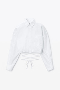 Front wrap details allow versatile tying and styling on this cropped white cotton oxford shirt. Scripted logo embroidery at the chest pocket, wide sleeves, and menswear-inspired collar and cuffs complete this modern-tailored top. - shirt collar - button placket with tie front - button cuffs - body composition: 100% cotton - made in China - model is 5'10" and wears a size s - 4WC2251000100 composition Body: 100%COTTON