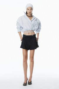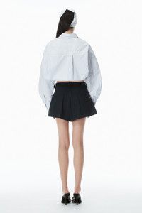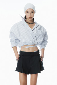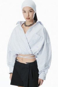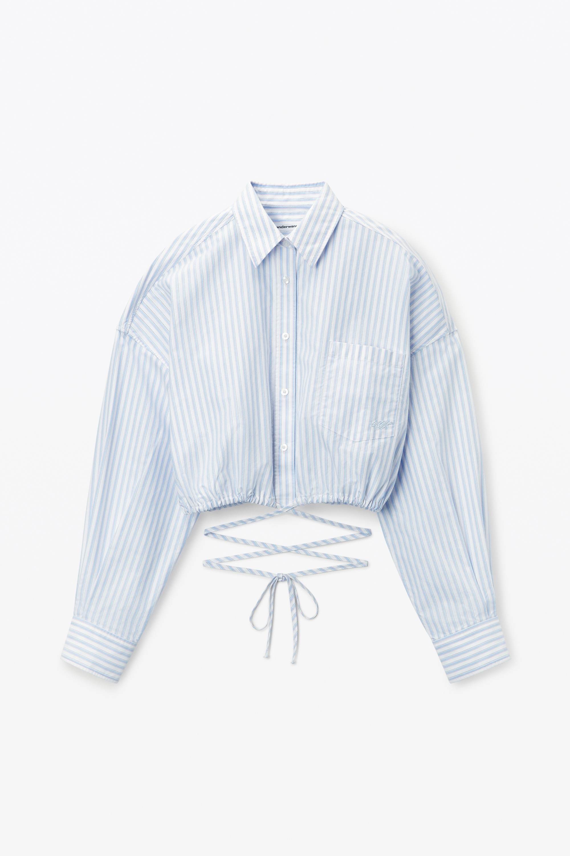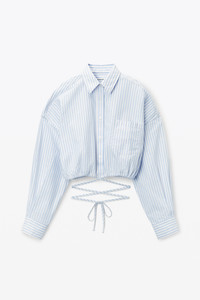 Front wrap details allow versatile tying and styling on this cropped blue and pink cotton oxford shirt. Scripted logo embroidery at the chest pocket, wide sleeves, and menswear-inspired collar and cuffs complete this modern-tailored top. - shirt collar - button placket with tie front - button cuffs - body composition: 100% cotton - made in China - model is 5'10" and wears a size s - 4WC2251000246 composition Body: 100%COTTON