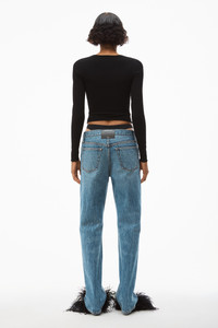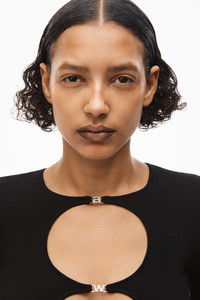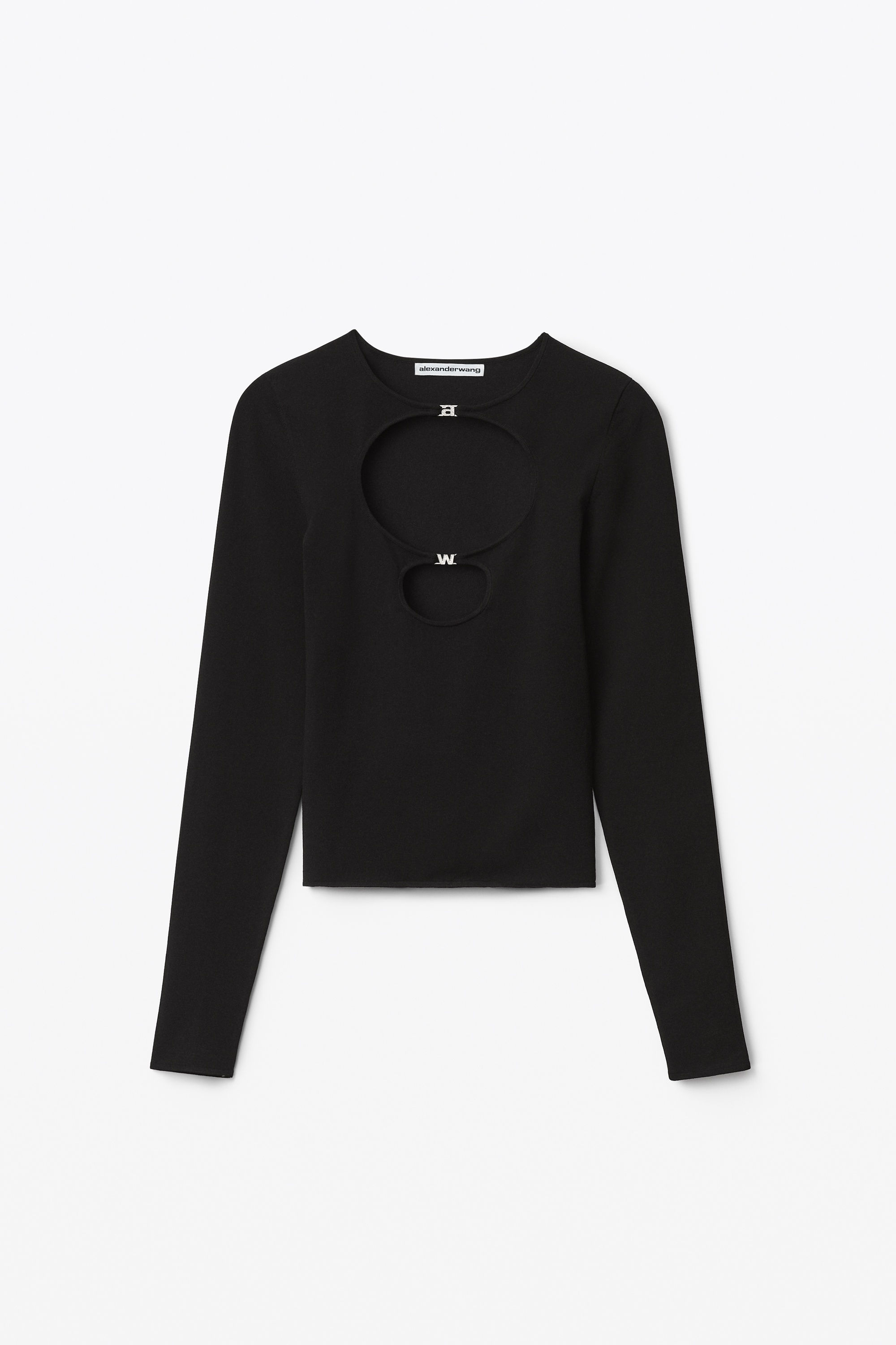 long sleeve top with integral cutouts at bust and crystal "a" and "w" charm closures in black compact stretch viscose - bodycon fit - hem hits at hip - composition: 90% polyamide / 10% elastane - made in china - model is 5'10" and wears a size s - 4KC1231036001